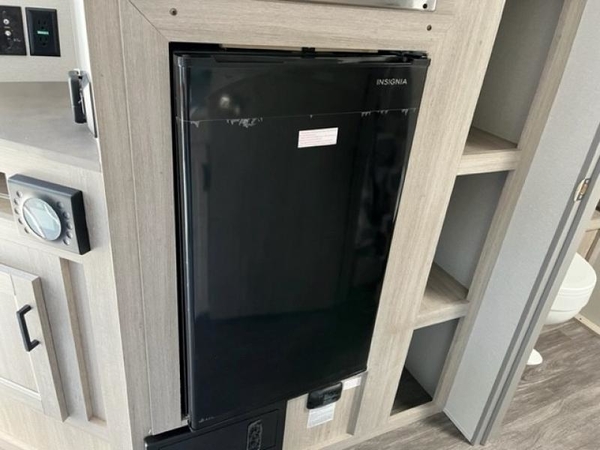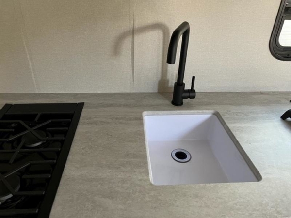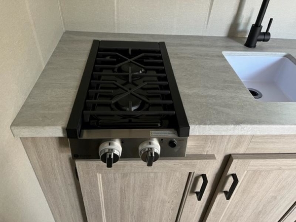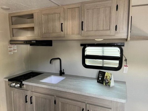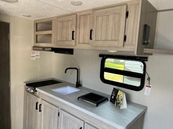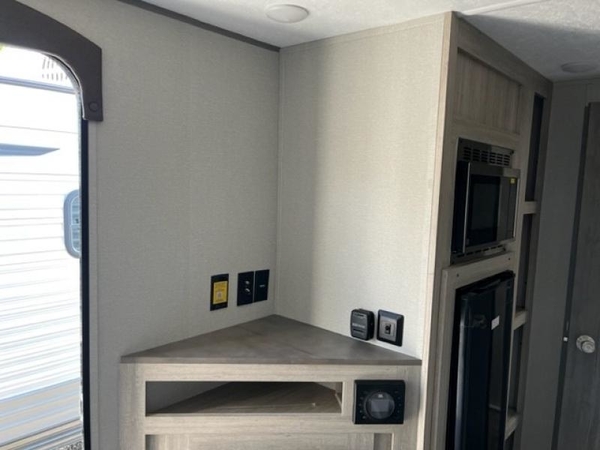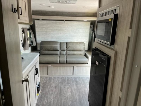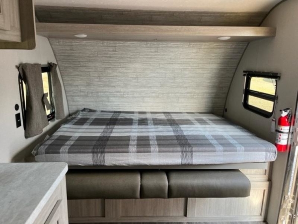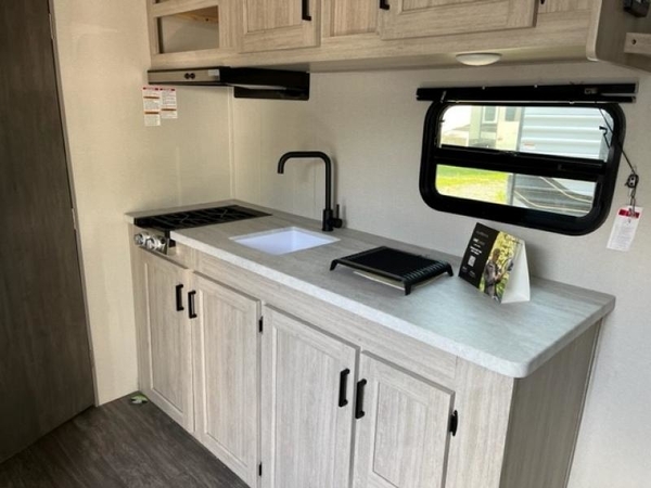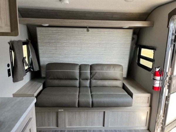 This value price point Aurora Light allows you versatility as you camp! You can sleep comfortably each night on the Murphy bed up front, then fold it away in the morning to relax on the sofa. There are dual nightstands for your things, plus overhead storage. This Aurora kitchen includes a 12V 10 cu. ft. refrigerator, a two burner cooktop, plus a microwave oven to easily make meals each day, and the full rear bath will come in handy after a day at the lake. After dinner, relax on the sofa, or head outdoors to relax under the 10' awning!