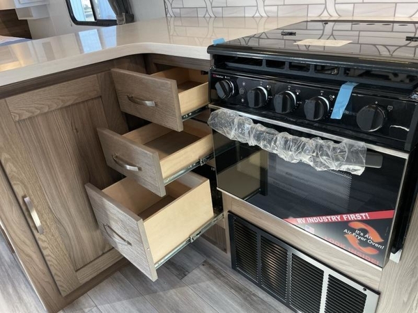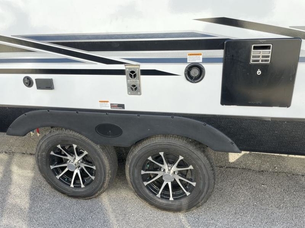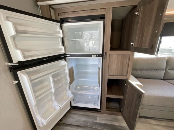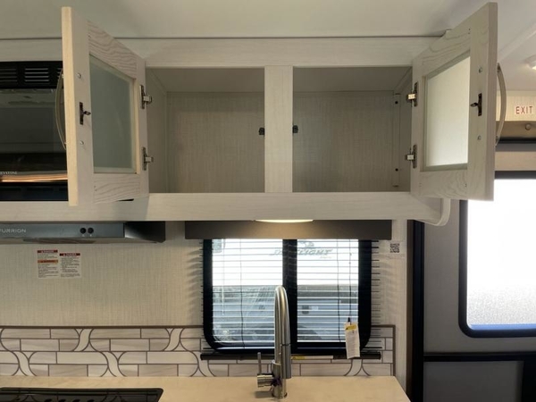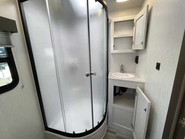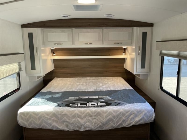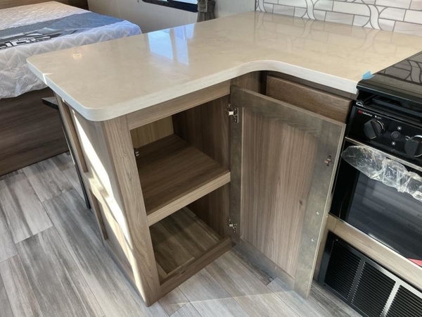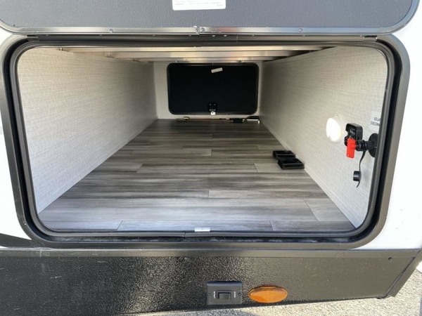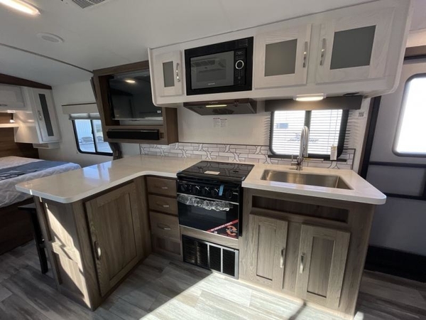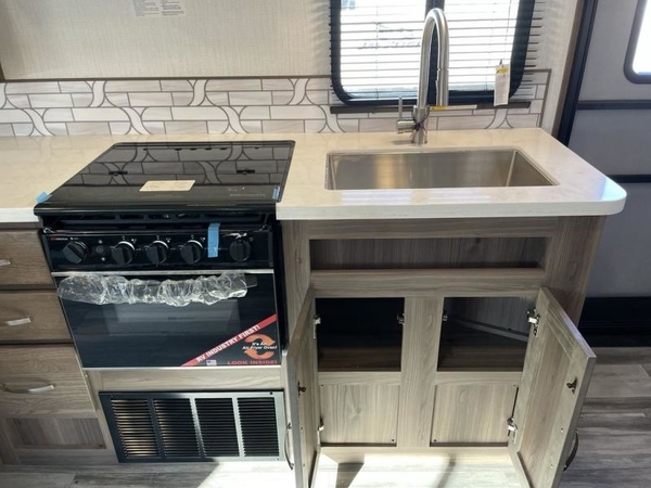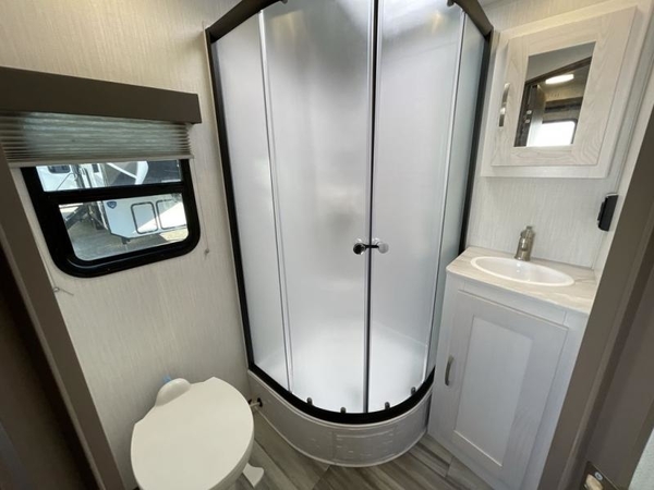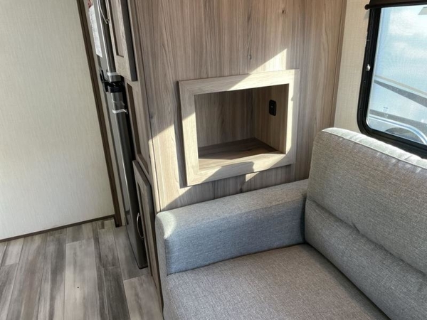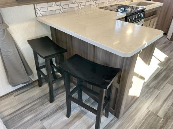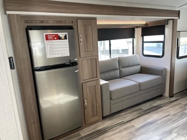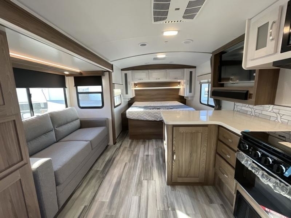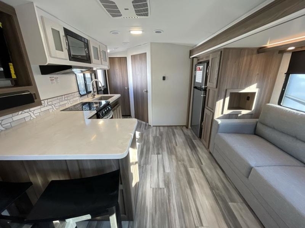 You will appreciate all of the space to move around in this cozy travel trailer for two thanks to the single slide! The spacious rear corner bathroom is conveniently located near the entry door for easy access when outside. A full chef tech kitchen, including a pantry, allows you to easily prepare and enjoy meals while you travel. You will love the air fryer oven, solid surface countertops, and 10 cu. ft. stainless steel refrigerator. An L-shaped counter features bar height seating for breakfast, and a residential tri-fold sofa is a great place for an afternoon nap or to watch your favorite movie on the LED TV. When you're ready to wind down your nights, head to the front of the unit where you can sleep soundly on the king-size sliding bed with a true Serta Comfort mattress!