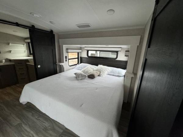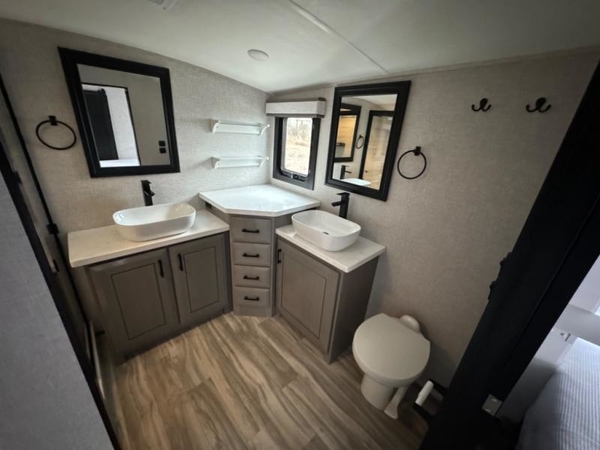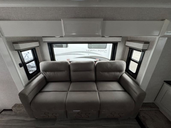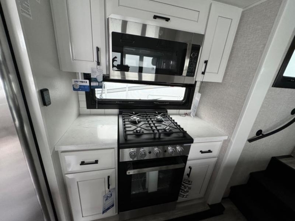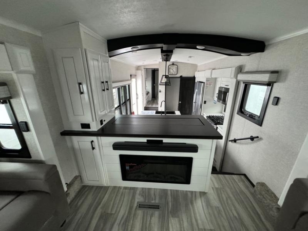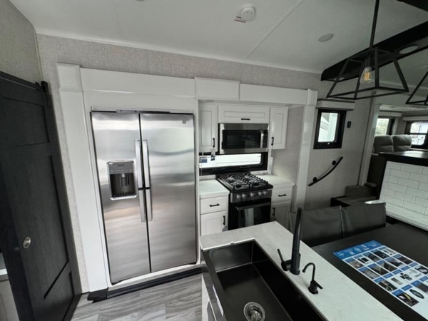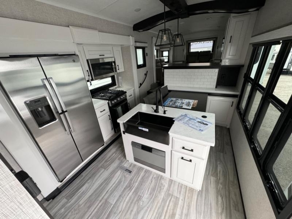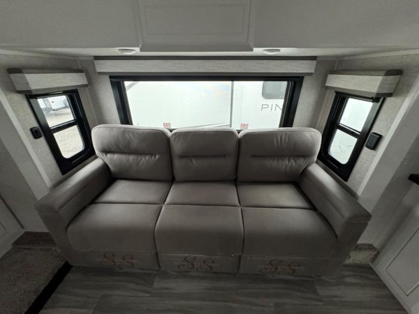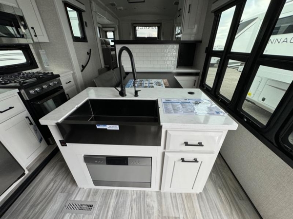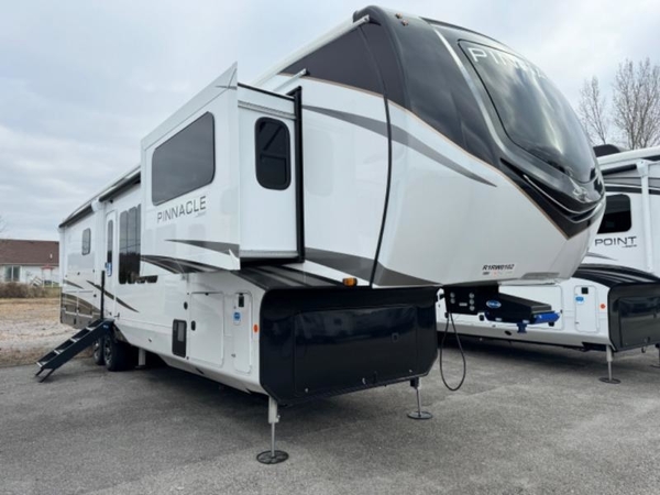 Each Pinnacle fifth wheel features Stronghold VBL lamination for the lightest, yet strongest construction in the RV industry. Add that to the Magnum Truss XL6 roof system and Climate Shield zero-degree tested weather protection and you'll be enjoying your fifth wheel for years to come. Some of the exterior conveniences you will appreciate are the Keyed-Alike lock system, the fully enclosed, universal docking center, and the 6-point hydraulic auto-leveling system for quick and easy set up. The 5 Star Handling Package will make towing a fifth wheel a walk in the park, and the two Whisper Quiet A/C units will keep you comfortable during the hot summer months. Inside, you'll enjoy the farmhouse stainless steel sink, the handcrafted hardwood glazed cabinetry, the vinyl flooring throughout, plus many more comforts. There is even a central vacuum system, a wireless remote control system, USB ports throughout, plus many more conveniences to make each trip enjoyable.