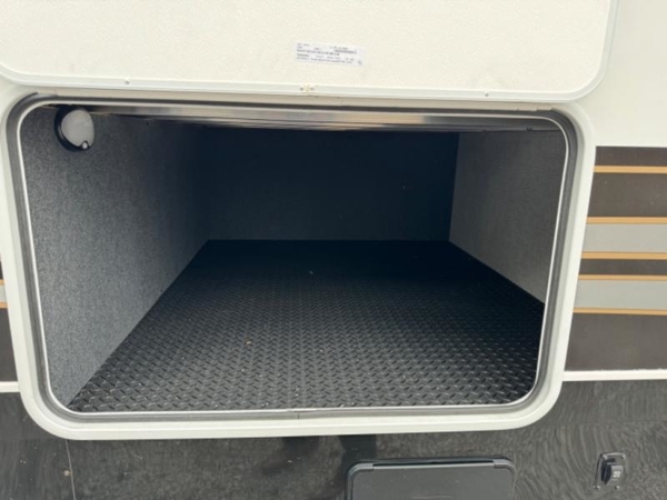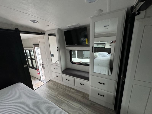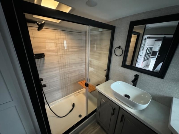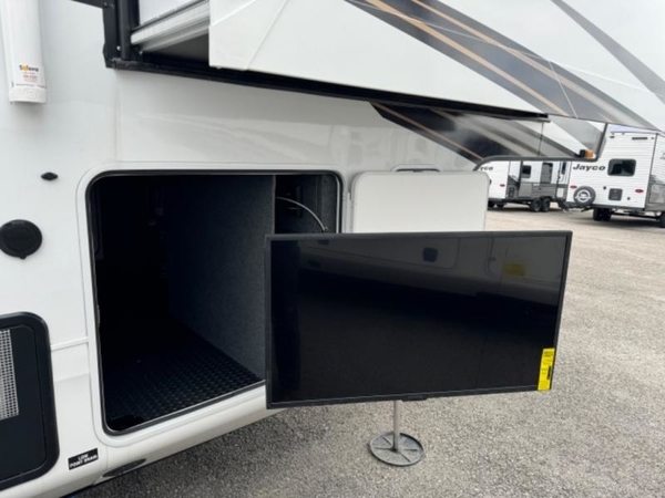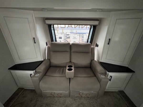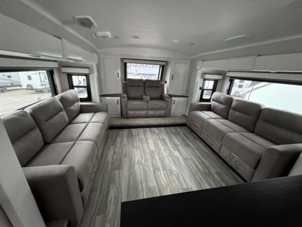 The ultimate in luxury and space is found in this quad slide out fifth wheel. The front living area includes two large tri-fold sofas, a 50" TV lift and a fireplace across from the theater seats. Check out the center kitchen with a sliding table top, a 32" TV to watch as you cook dinner, plus under-table storage for kitchen necessities. This model also includes an outside kitchen the chef is sure to enjoy, especially with two power awnings for maximum protection. The master bedroom will make you feel like royalty with its king bed, two wardrobes and a bench, plus a full rear bath. The huge vanity with dual bath sinks will allow you both to get ready at the same time, plus there is a walk-in shower with a seat for added convenience.