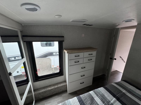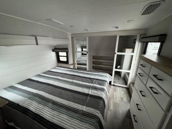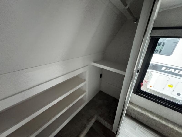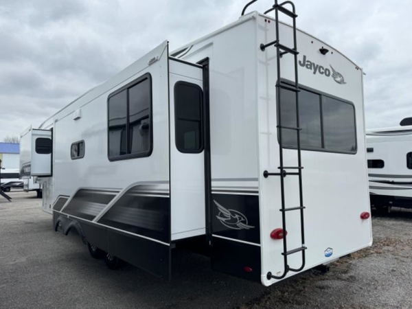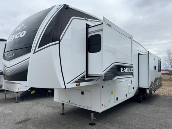 With any Eagle fifth wheel or travel trailer by Jayco you will appreciate durable construction materials, like the Magnum Truss Roof and the Stronghold VBL laminated walls. The JAYCOMMAND Smart RV system puts you in control of your RV's functions, and the 5 Star Handling Package will provide smooth towing from home to camp. Each model features Climate Shield zero-degree tested weather protection and the industry-exclusive HELIX cooling system that features two 15,000 BTU Whisper Quiet A/C's to keep you comfortable year around. Some of the exterior conveniences you are sure to love are the fully enclosed, LED-lit universal docking station, the pass-through storage with Slam-Latch baggage doors, and an automotive style front cap with max turn radius. The Eagle fifth wheels and travel trailers are designed to make you feel at home with solid hardwood slide fascia, residential vinyl flooring, a bathroom skylight, and plenty of storage for all your belongings.