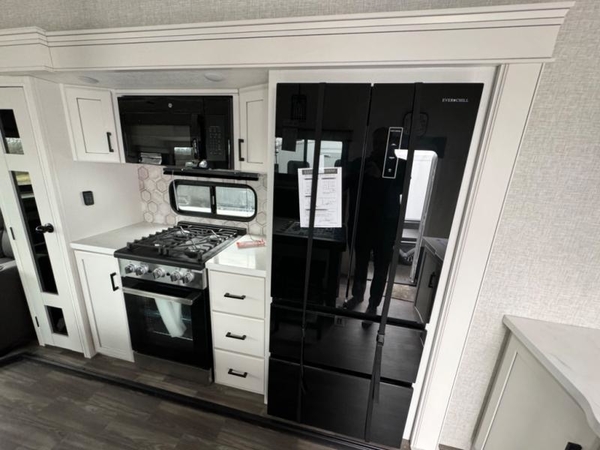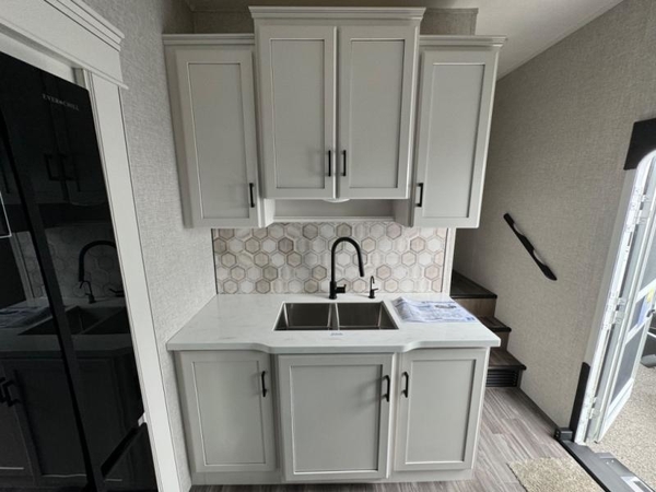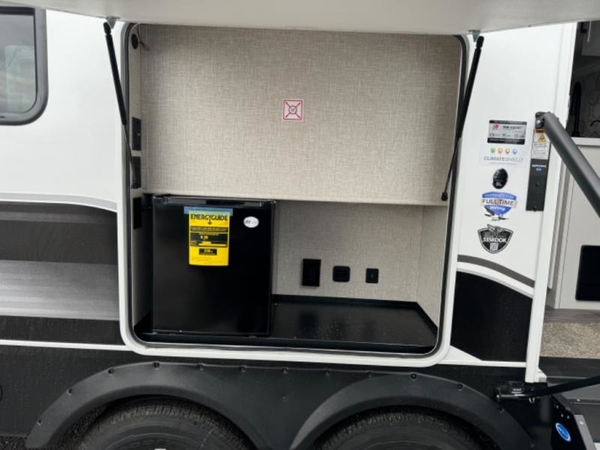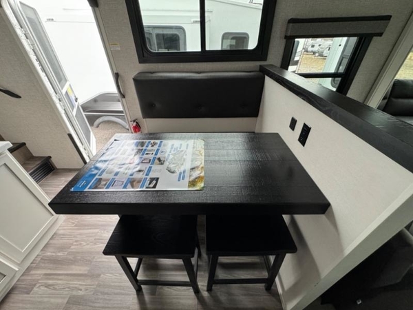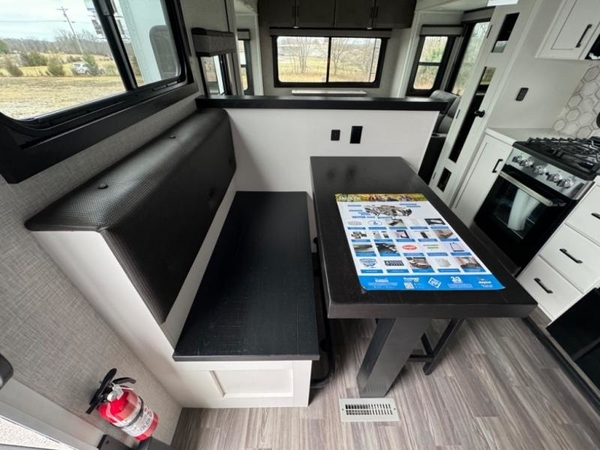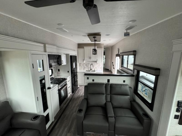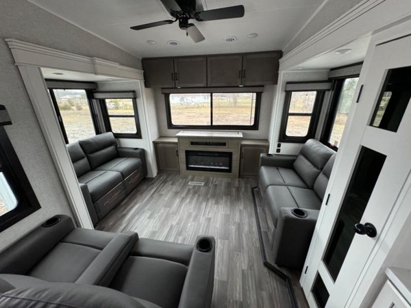 Head out on a great weekend adventure with this fifth wheel! It features a front private bedroom with a king bed that could be switched out for an optional queen bed, a chest with a TV above, and a front walk-in closet with shelves and prep for an optional washer and dryer. The full bathroom has a shower with a seat and a linen closet to keep your towels close. The chef will enjoy preparing meals in the kitchen with the three burner cooktop, but might love using the outside kitchen even more. When you're ready to wind down your nights you can either play card games at the table and chairs with a bench or head to the rear living area and relax on one of the two tri-fold sofas or theater seating across from the entertainment center with a fireplace!