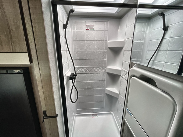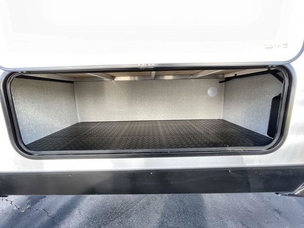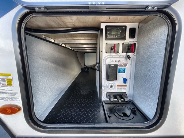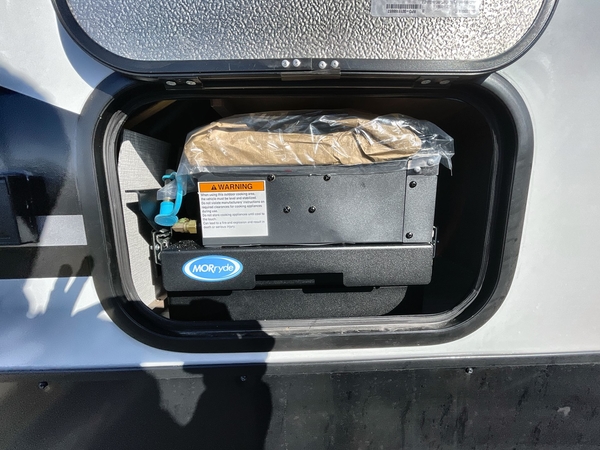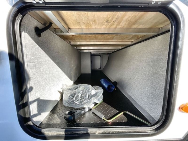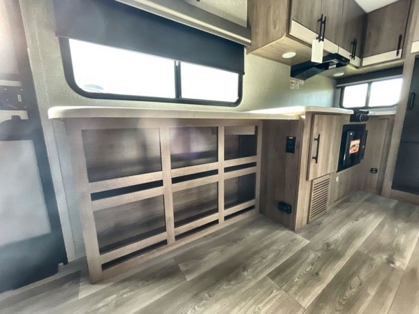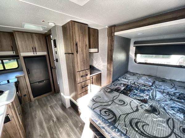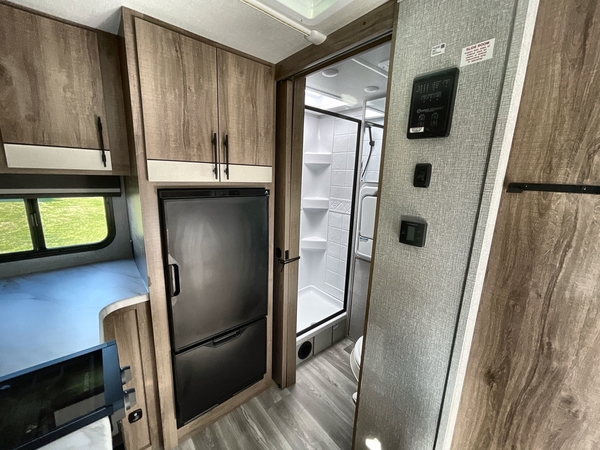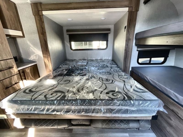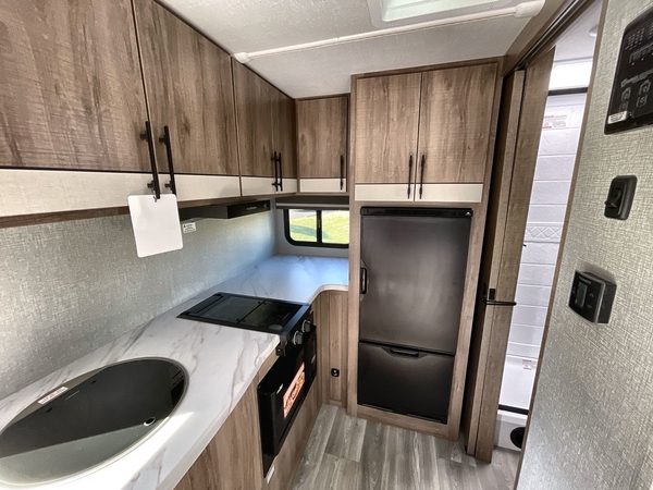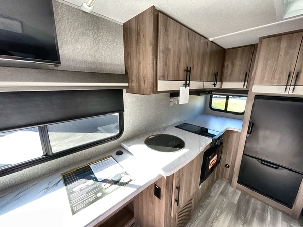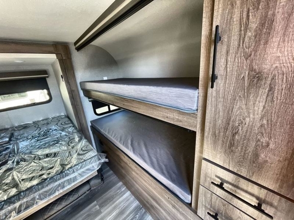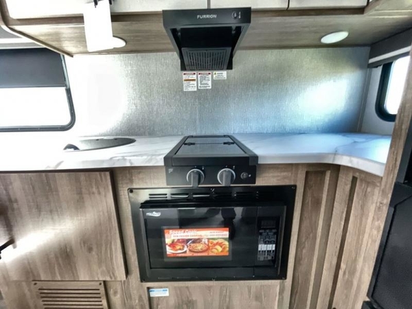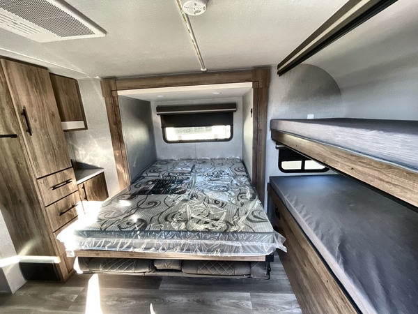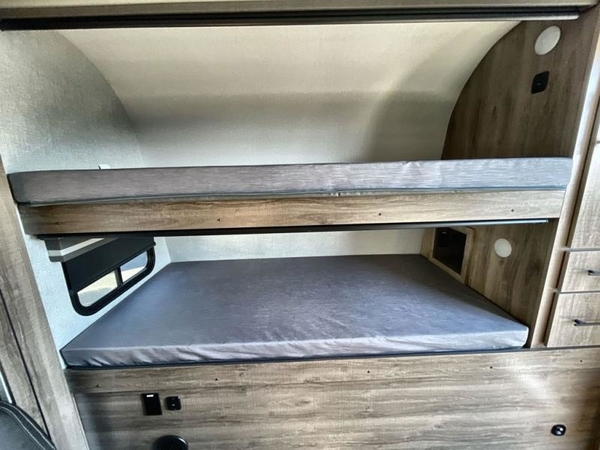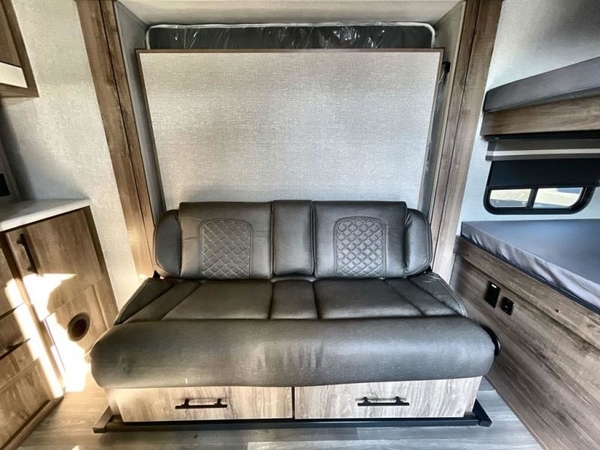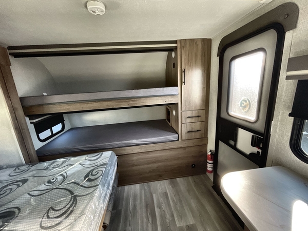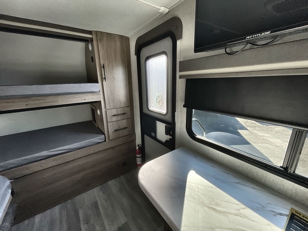 Head to far-off adventures in this lightweight travel trailer that can sleep four each night. There are front bunk beds with pull-down privacy blinds and a wardrobe to keep clothes tidy. You'll enjoy the Murphy bed slide out for seating and sleeping space, and there is also a removable table here and two drawers for storage. The full kitchen includes a two burner cooktop, a convection microwave, plus a 12V refrigerator for food storage. You can dine each day at the bar tabletop with three stools, or take your plate outdoors to sit under the 12' power awning with LED lights.
