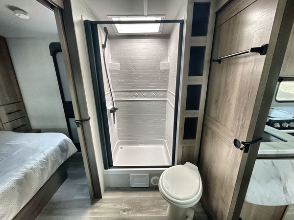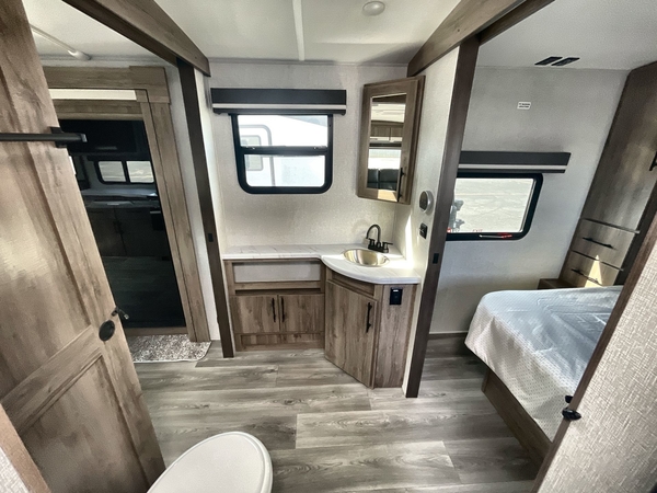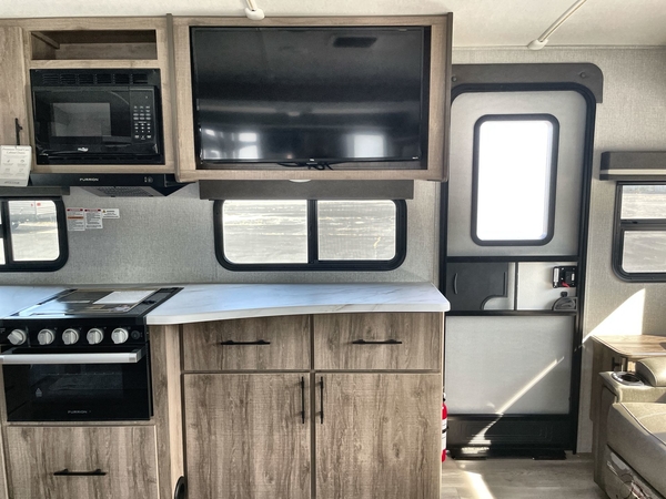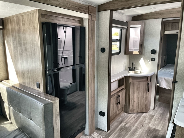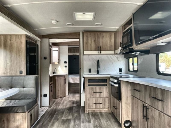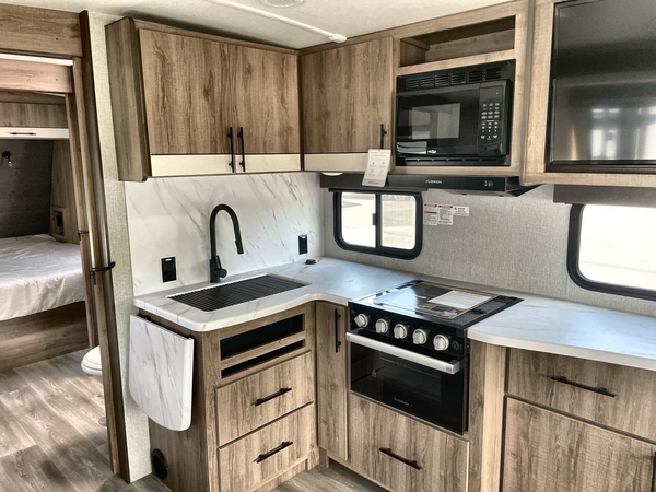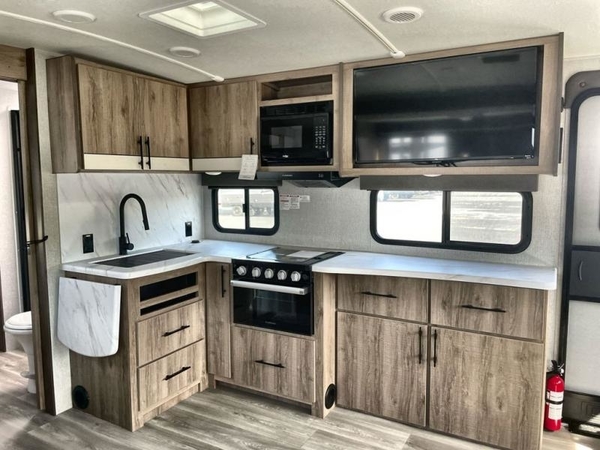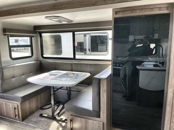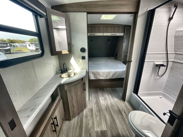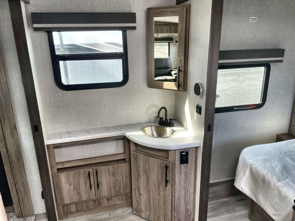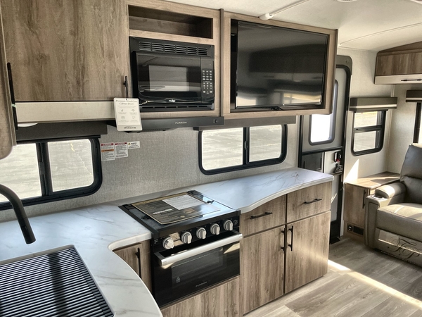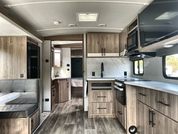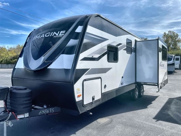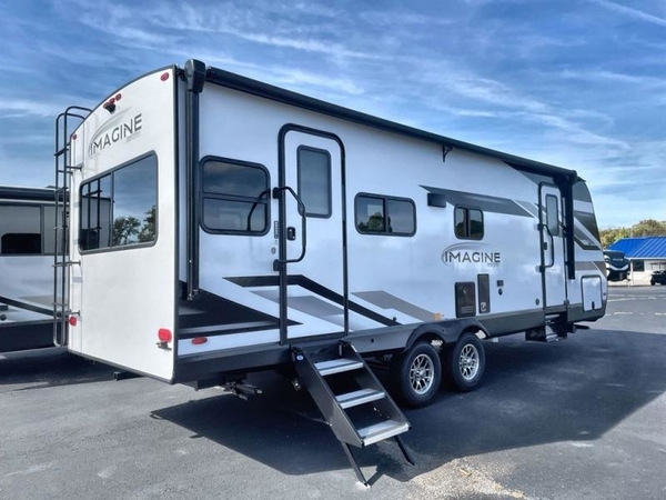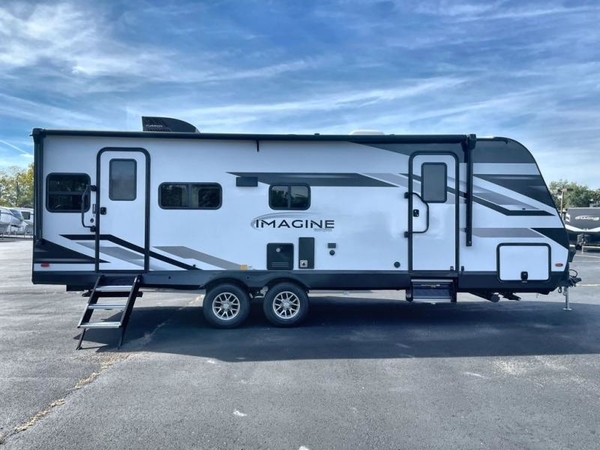 You will have an amazing amount of fun in this Imagine travel trailer! There is a tri-fold sofa and U-shaped dinette with removable ottoman that you can relax on while you watch the LED HDTV, and this trailer has two entry doors so that you can come and go as you please. The private bedroom contains the second entry door, so you can quickly head inside to grab a sweatshirt when you need one. While you're outside, you'll have a 21' power awning to protect you, and there is an exterior coax TV hookup, LP quick connect, and spray port to make your camping life easier. The interior walk-through bathroom connects the bedroom to the rest of the trailer, and the kitchen has a countertop extension so that you can chop veggies on extra counter space.