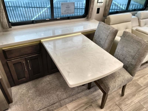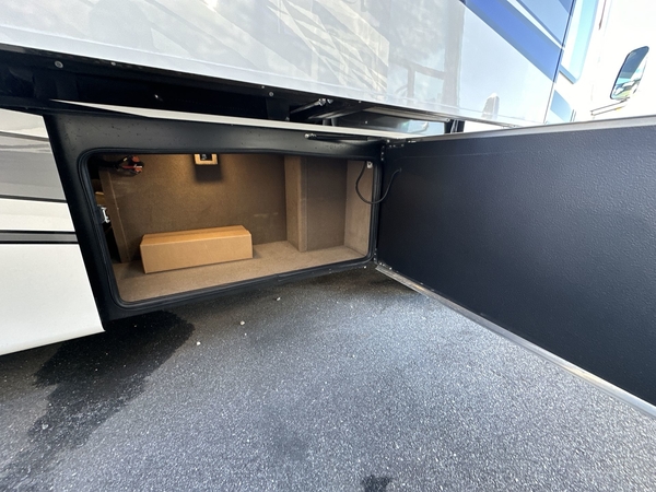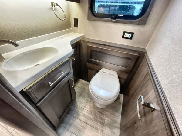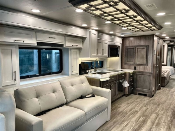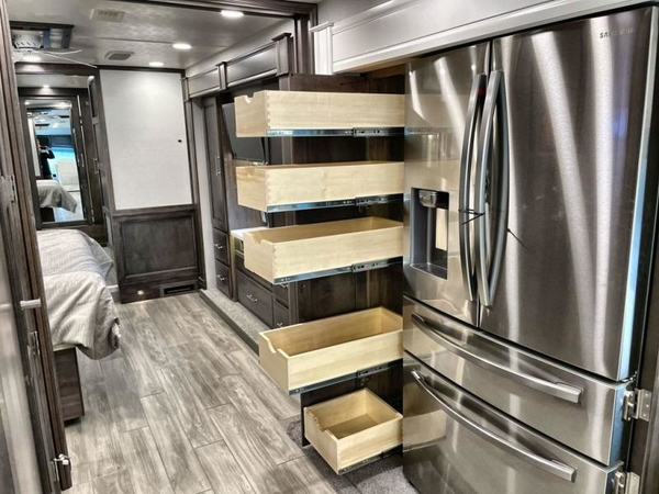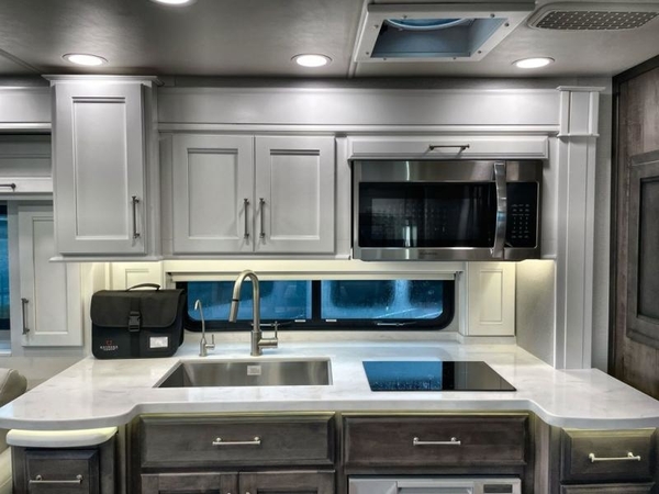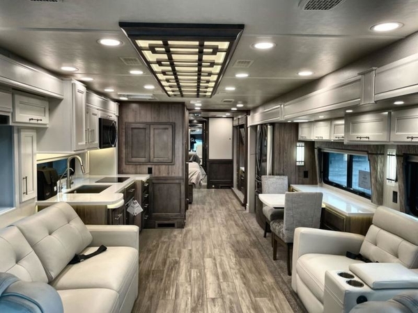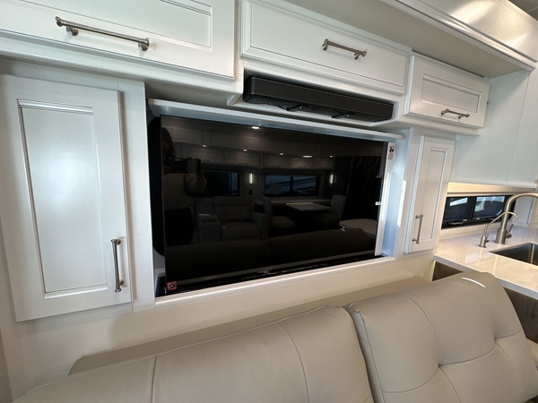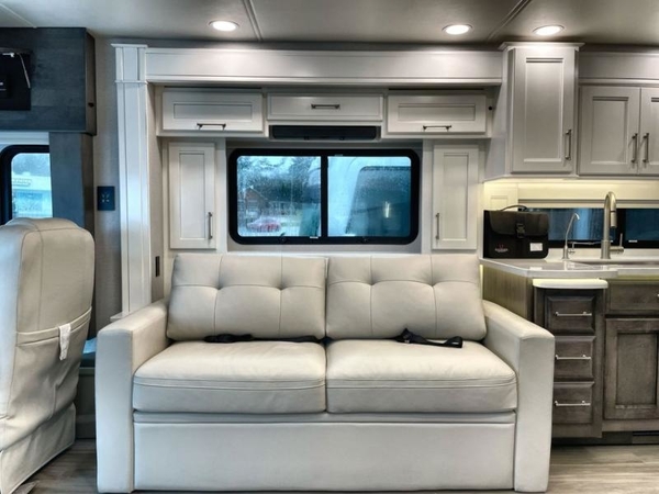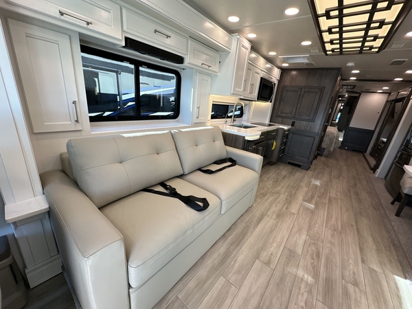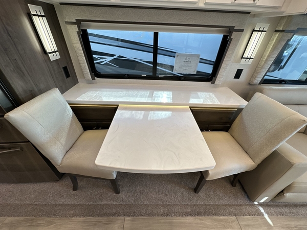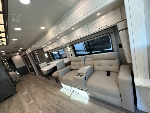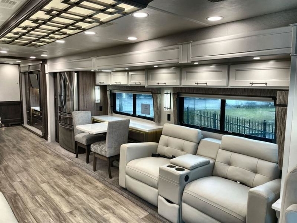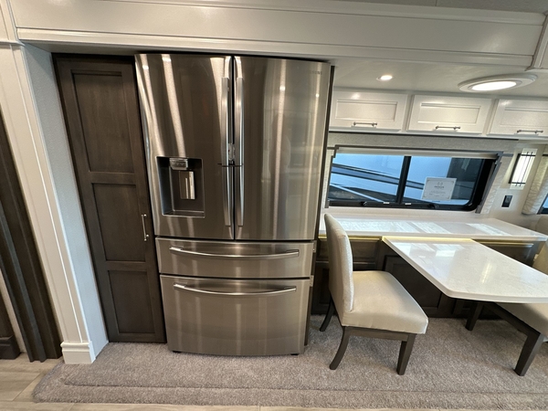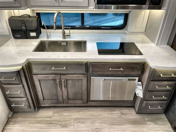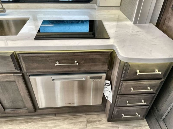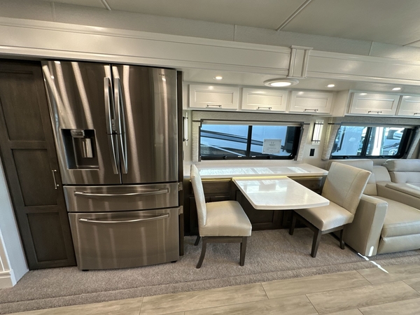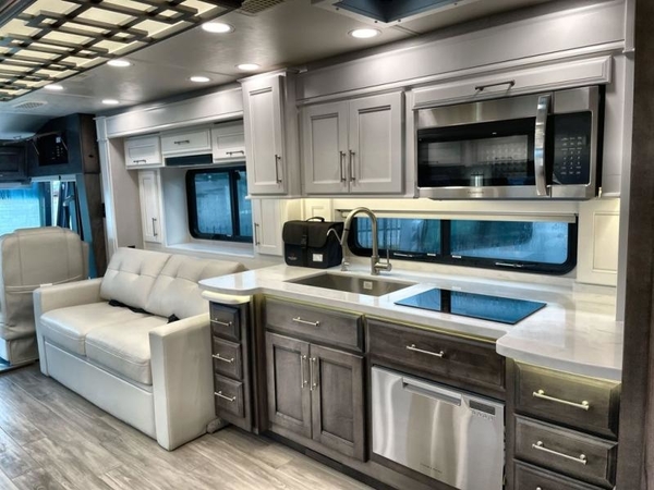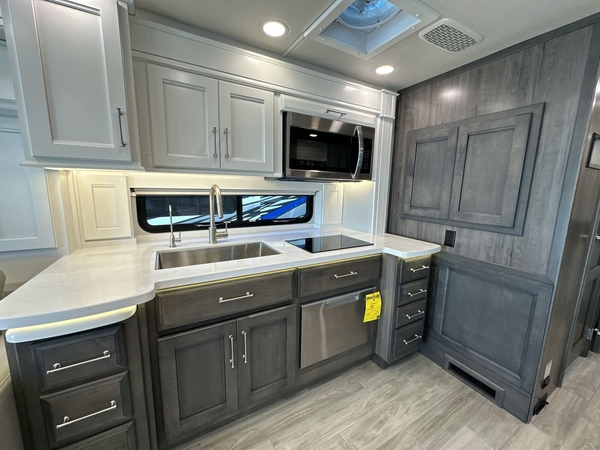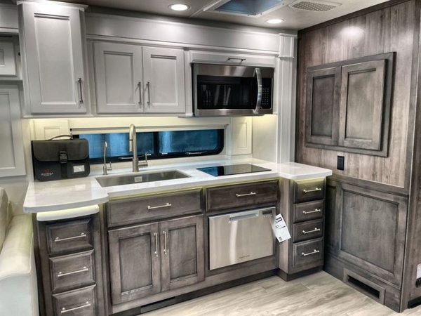 Travel in luxury in this four slide out coach with sleeping space for four! You will sleep soundly each night on the king bed slide out, while you're guests sleep on the hide-a-bed sofa across from the power theater seating. The free-standing dinette with chairs will provide a place to dine after breakfast is made on the two burner induction cooktop, and there is a Fisher and Paykel dishwasher for easy clean up. You're going to love having a full rear bath onboard with a bath wardrobe and a separate washer and dryer, plus there is a half bath mid-coach for guests!