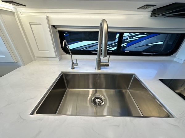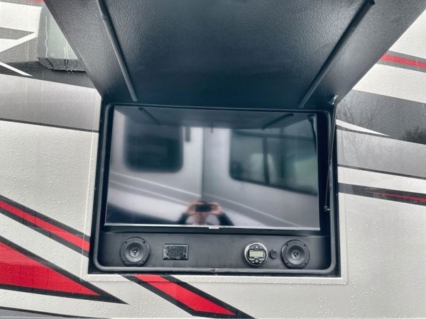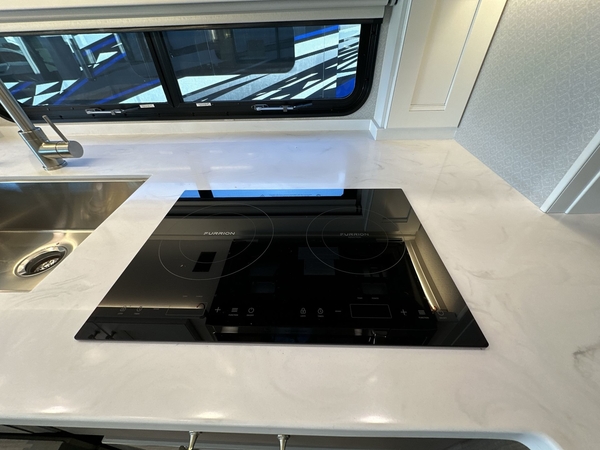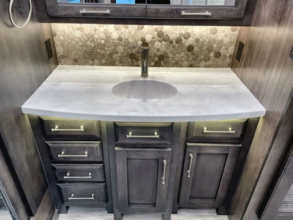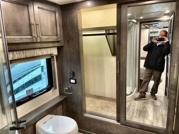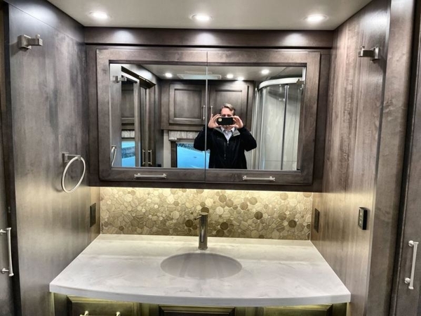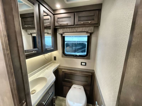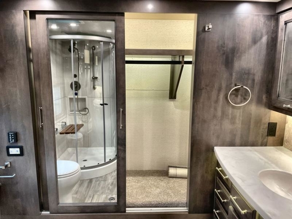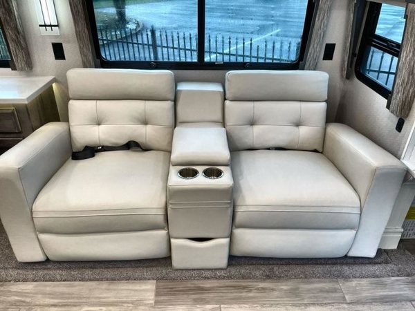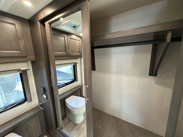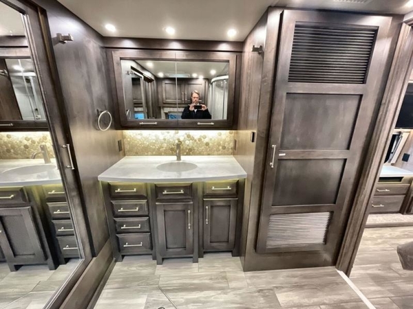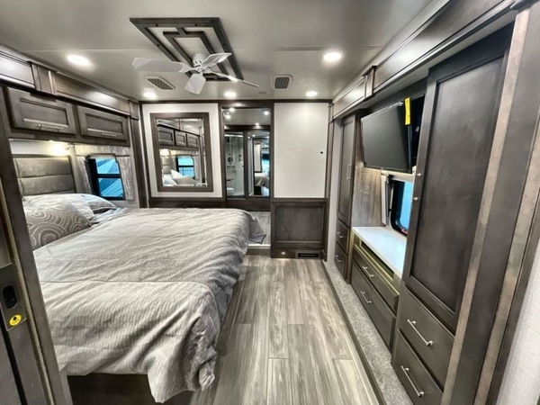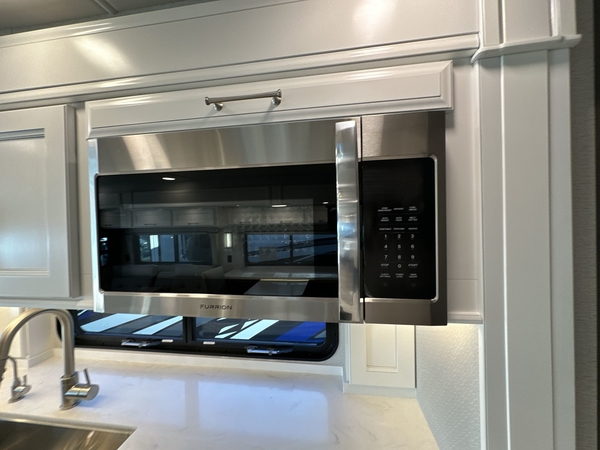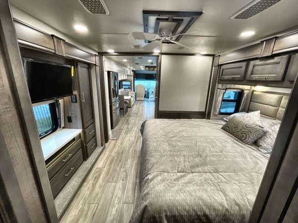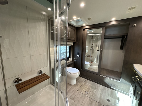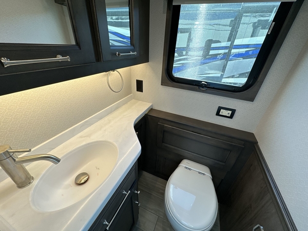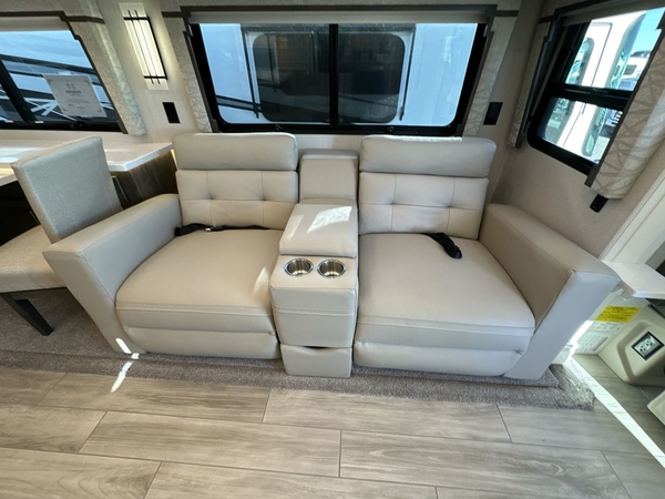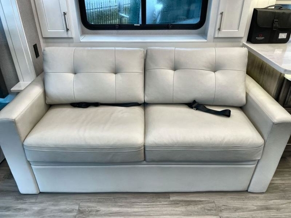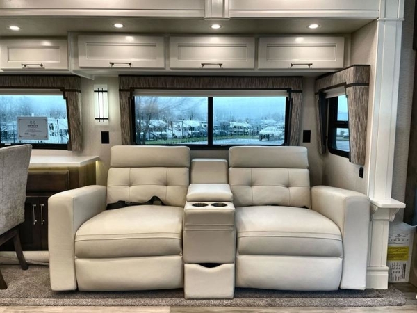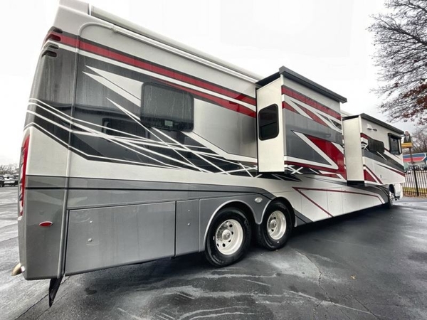 Travel in luxury in this four slide out coach with sleeping space for four! You will sleep soundly each night on the king bed slide out, while you're guests sleep on the hide-a-bed sofa across from the power theater seating. The free-standing dinette with chairs will provide a place to dine after breakfast is made on the two burner induction cooktop, and there is a Fisher and Paykel dishwasher for easy clean up. You're going to love having a full rear bath onboard with a bath wardrobe and a separate washer and dryer, plus there is a half bath mid-coach for guests!