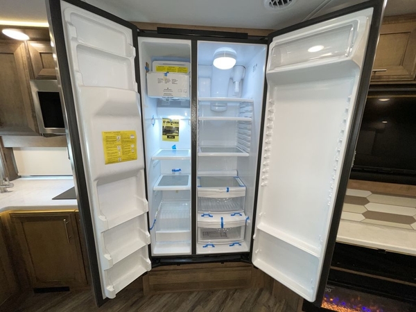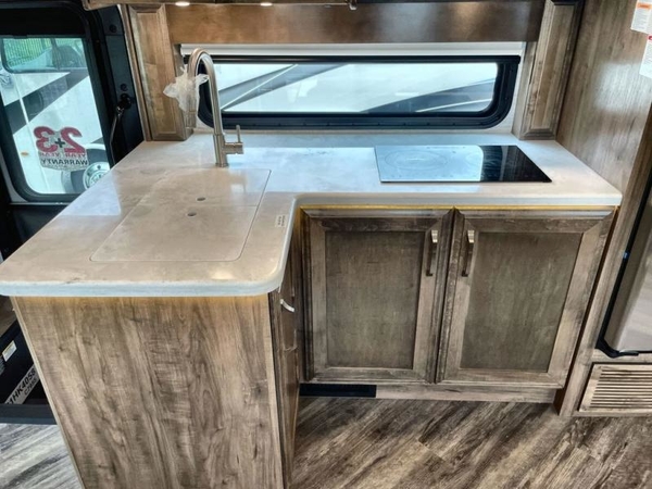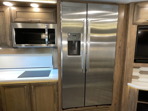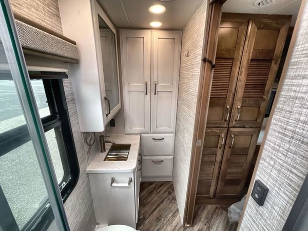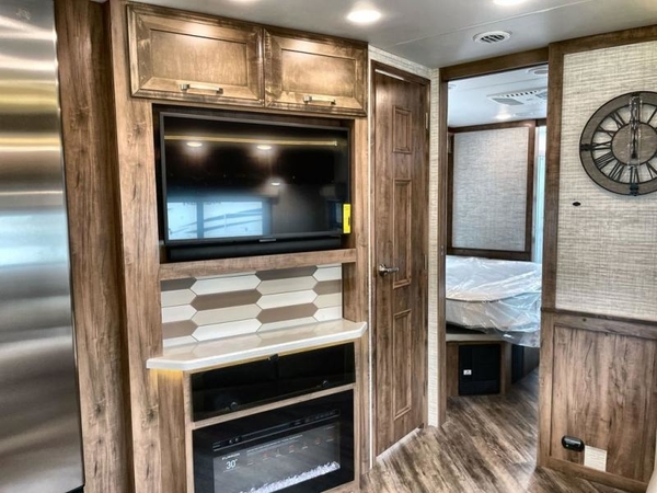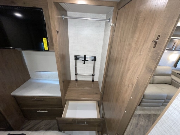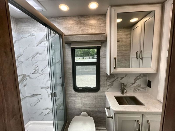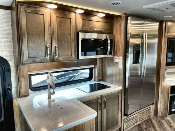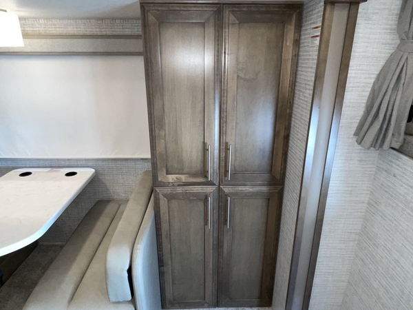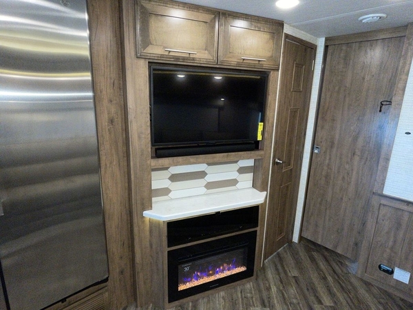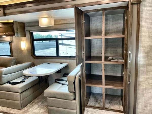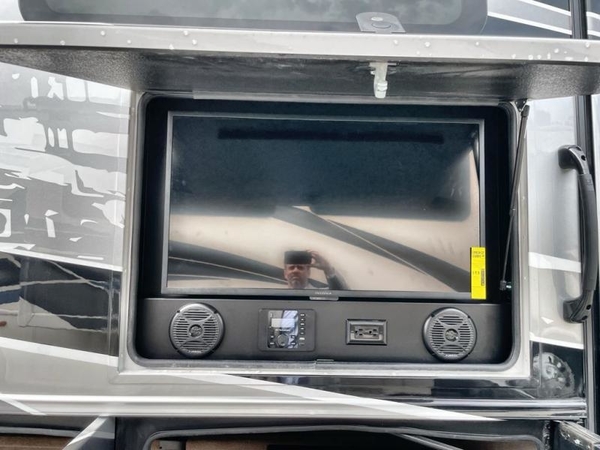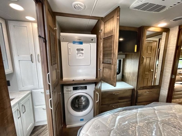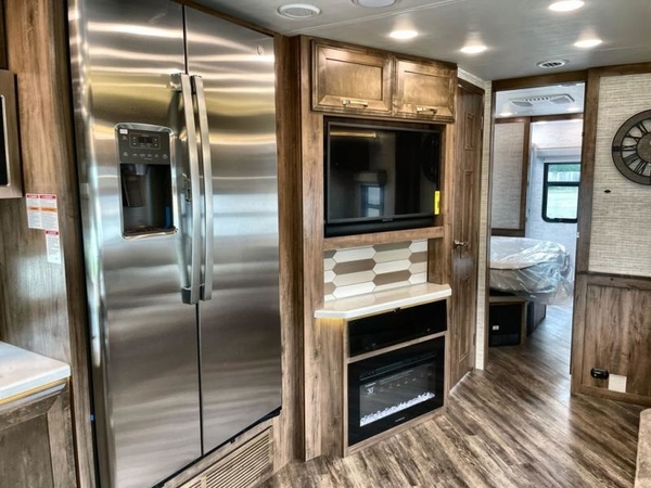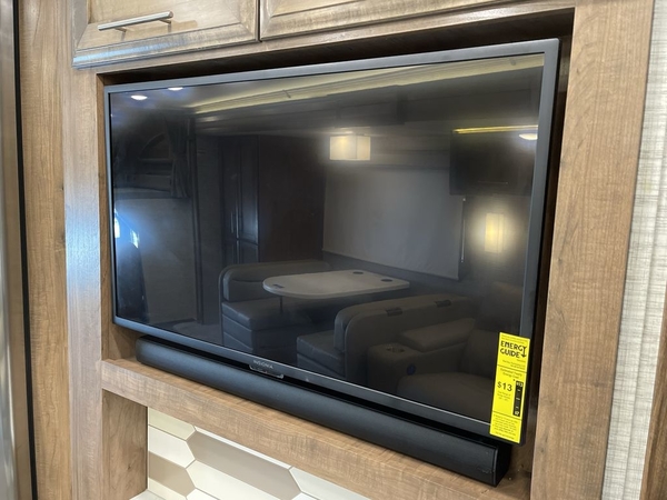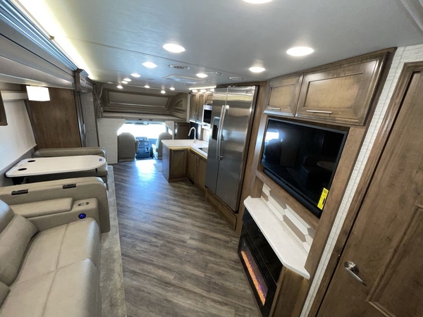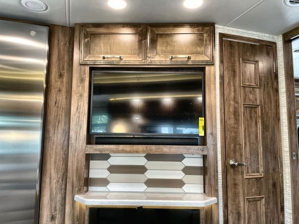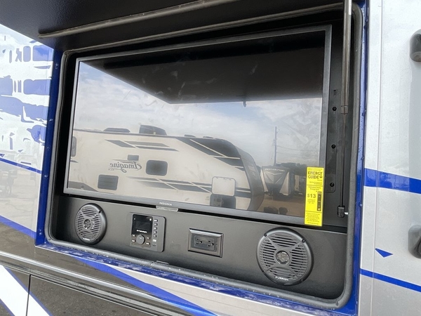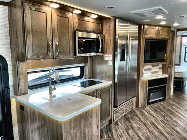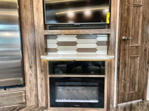 You will find lots to love with this motorhome! From the bath and a half to the bunk over cab and outside entertainment center. The chef can prepare their best meals with the two burner induction cooktop and the residential refrigerator. There's a large pantry next to the booth dinette so you can quickly grab a snack during game night or if you prefer to relax instead then you can enjoy the fireplace and 39" LED HD Smart Fire TV while sitting on the 93" reclining sofa. The master suite has a king bed slide with a power head lift to lay your head on at night, a LED HD Smart TV with a wardrobe and storage area next to it, as well as an area prepped to add an optional washer and dryer. You even have access to the full rear bathroom which has a 30" x 36" shower and a wardrobe to keep your linens close.
