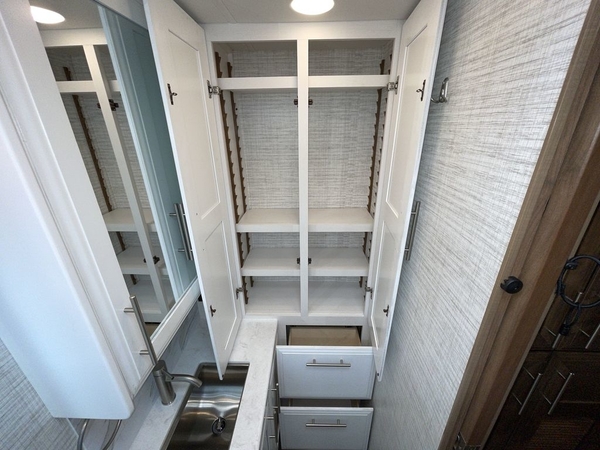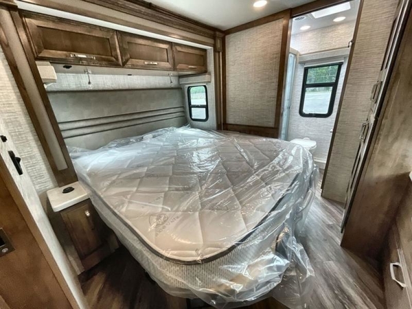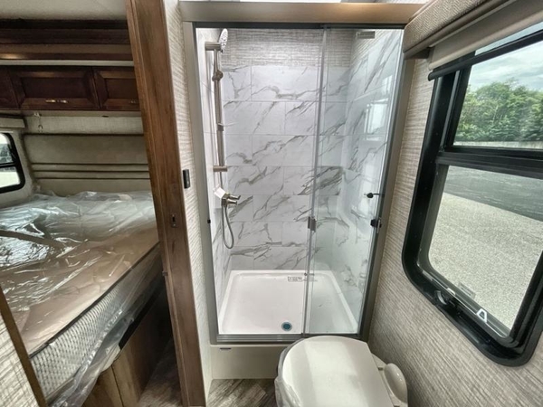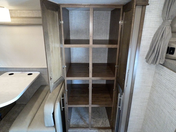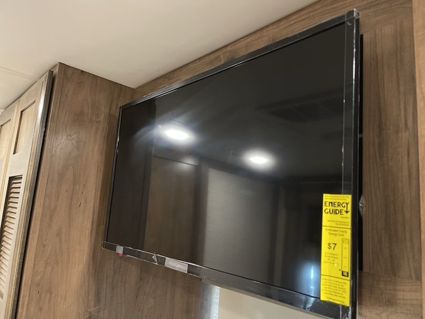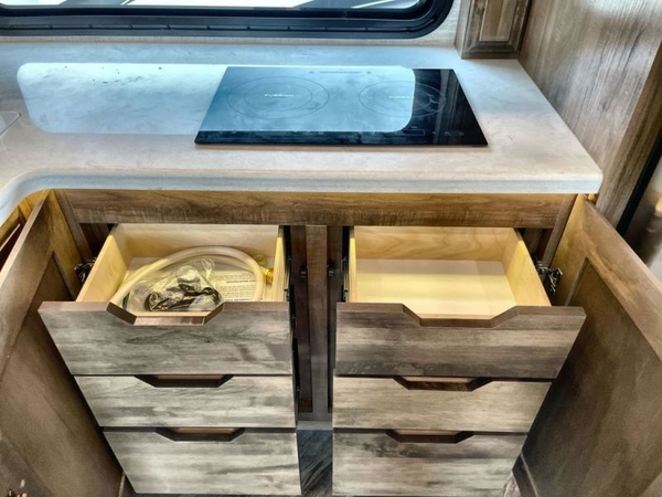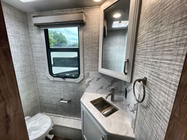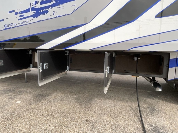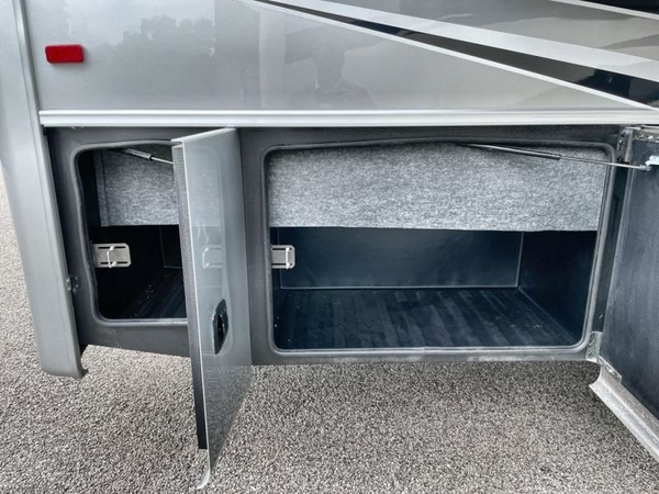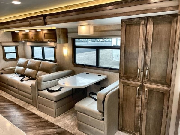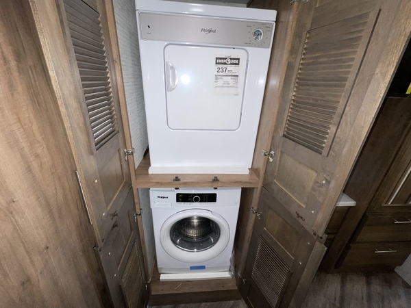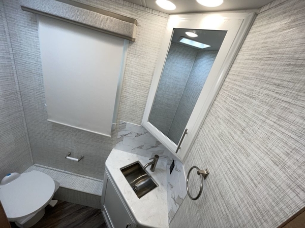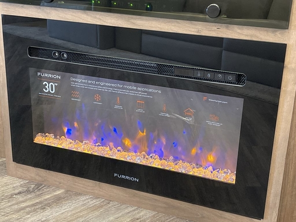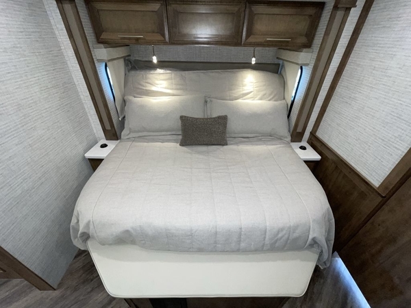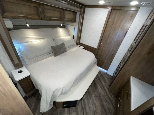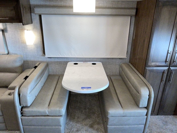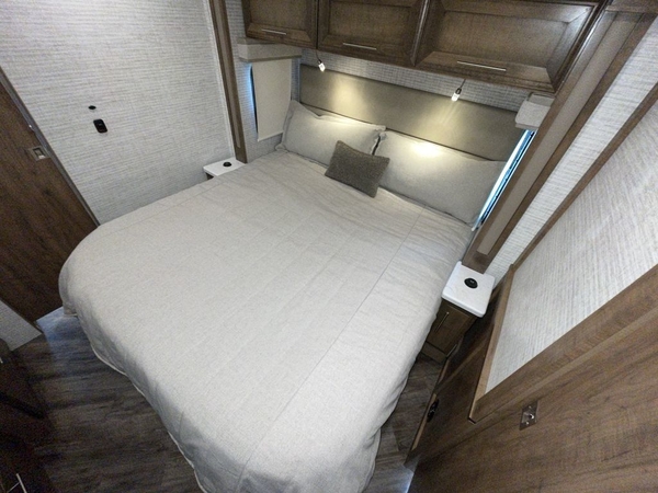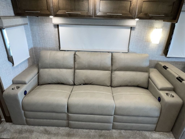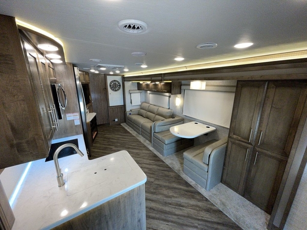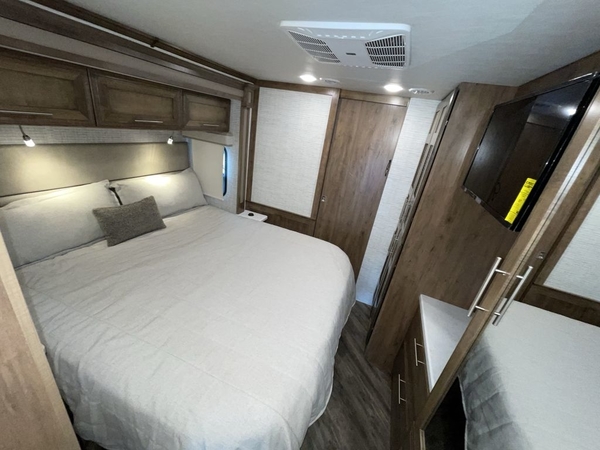 You will find lots to love with this motorhome! From the bath and a half to the bunk over cab and outside entertainment center. The chef can prepare their best meals with the two burner induction cooktop and the residential refrigerator. There's a large pantry next to the booth dinette so you can quickly grab a snack during game night or if you prefer to relax instead then you can enjoy the fireplace and 39" LED HD Smart Fire TV while sitting on the 93" reclining sofa. The master suite has a king bed slide with a power head lift to lay your head on at night, a LED HD Smart TV with a wardrobe and storage area next to it, as well as an area prepped to add an optional washer and dryer. You even have access to the full rear bathroom which has a 30" x 36" shower and a wardrobe to keep your linens close.