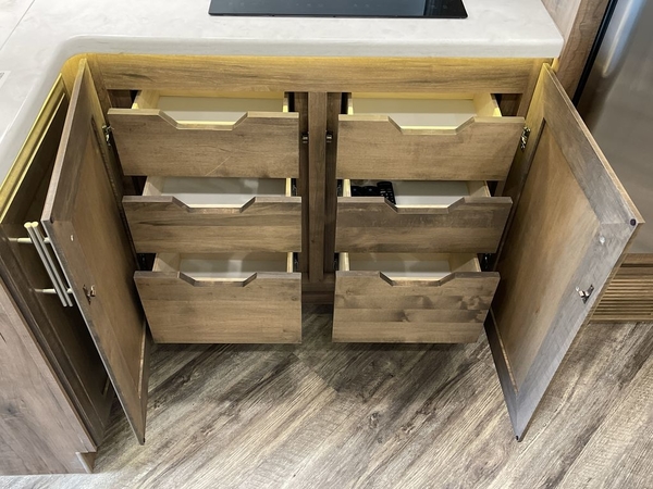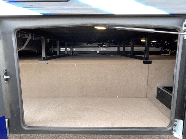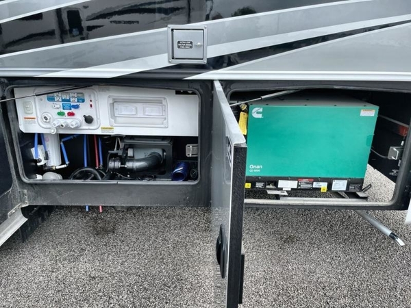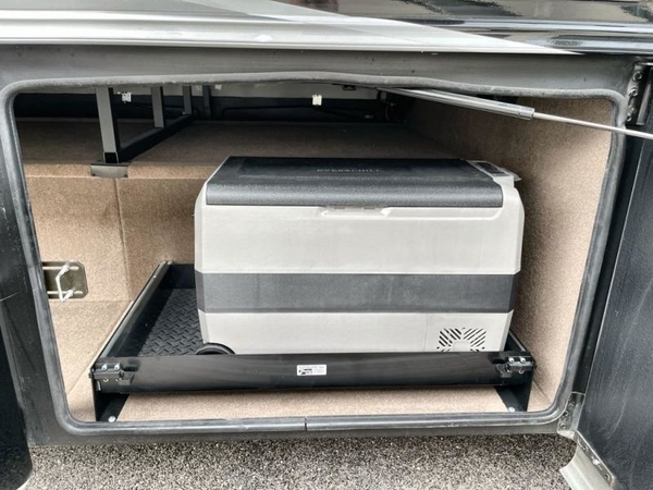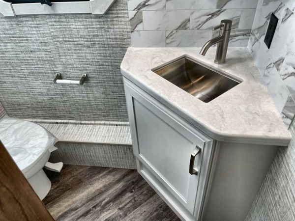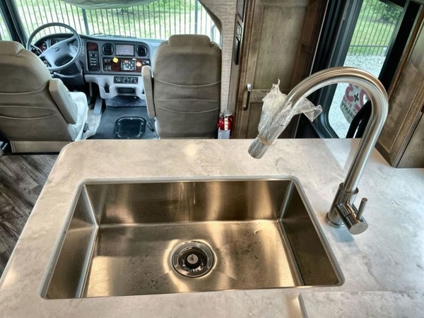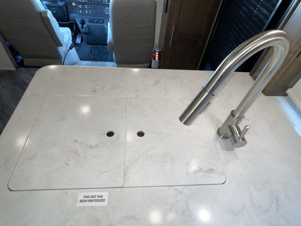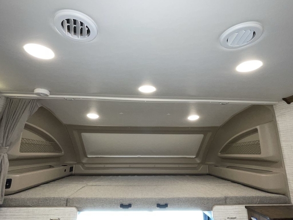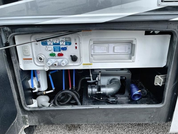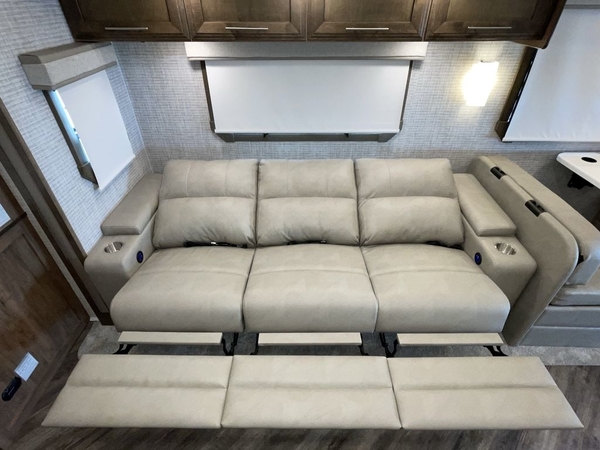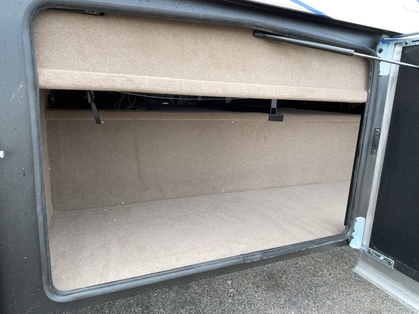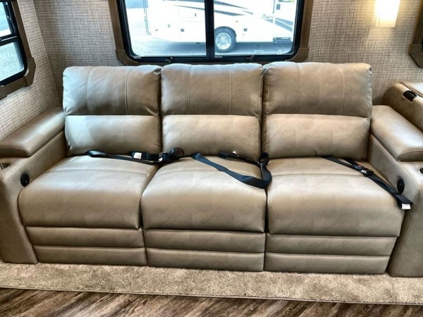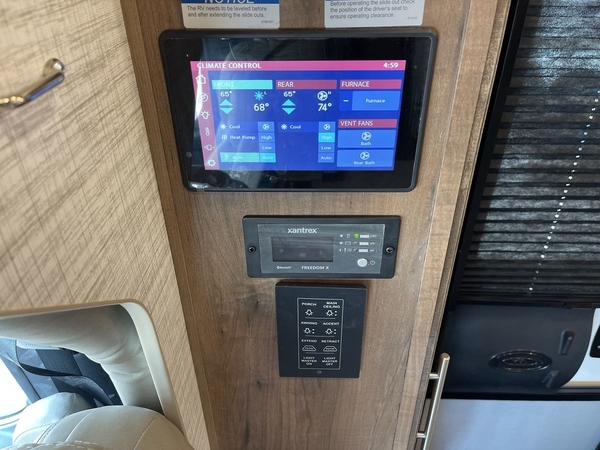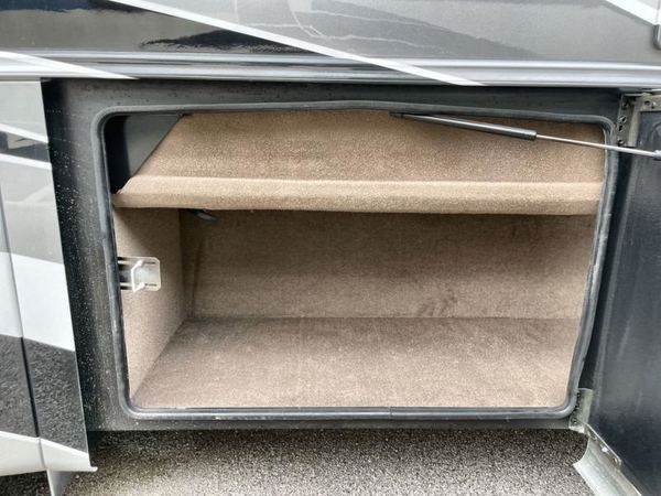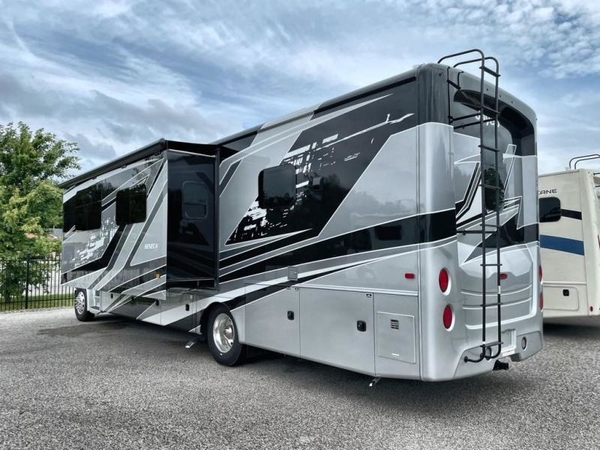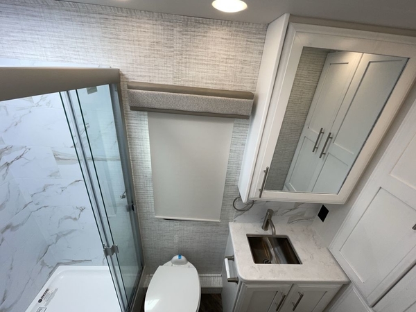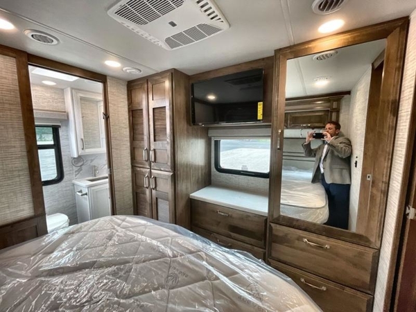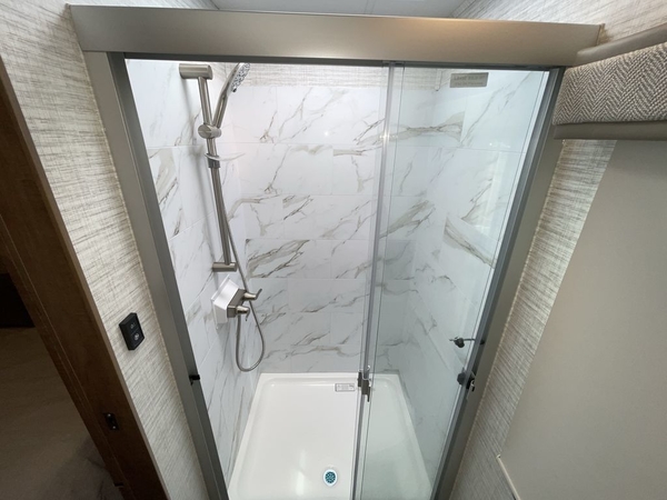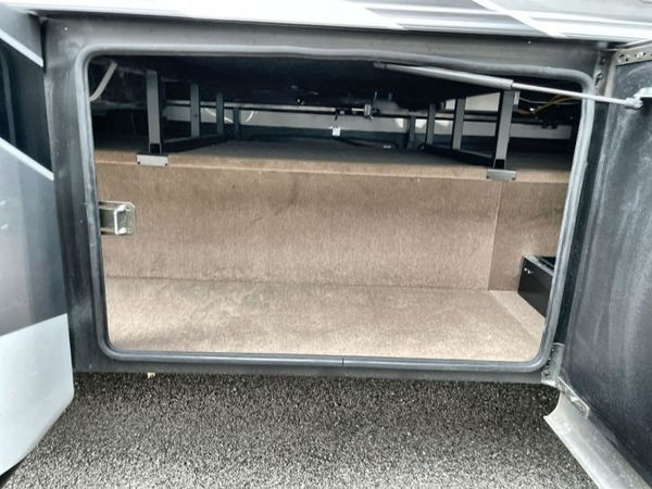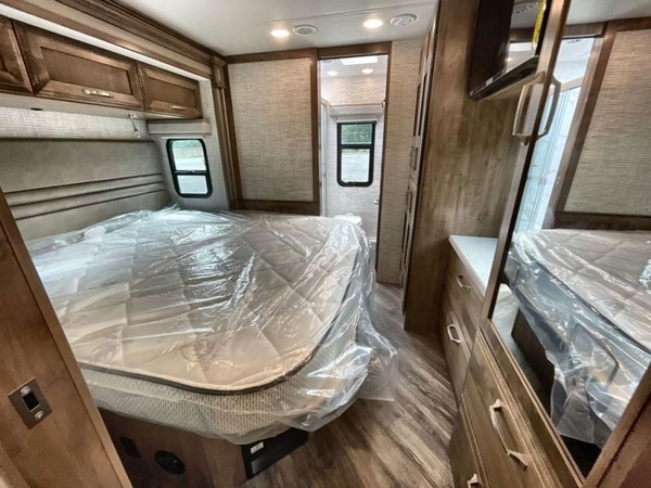 You will find lots to love with this motorhome! From the bath and a half to the bunk over cab and outside entertainment center. The chef can prepare their best meals with the two burner induction cooktop and the residential refrigerator. There's a large pantry next to the booth dinette so you can quickly grab a snack during game night or if you prefer to relax instead then you can enjoy the fireplace and 39" LED HD Smart Fire TV while sitting on the 93" reclining sofa. The master suite has a king bed slide with a power head lift to lay your head on at night, a LED HD Smart TV with a wardrobe and storage area next to it, as well as an area prepped to add an optional washer and dryer. You even have access to the full rear bathroom which has a 30" x 36" shower and a wardrobe to keep your linens close.