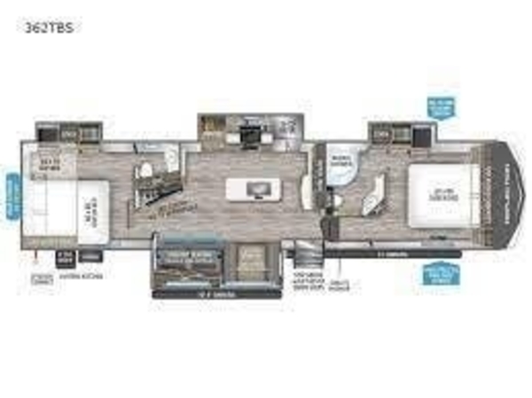 The Reflection 362TBS features an elegant and aerodynamic exterior design that not only looks stylish but also enhances fuel efficiency while towing. With its fiberglass sidewalls, premium graphics, and LED lighting, it's sure to turn heads at any campsite. This fifth-wheel RV offers a spacious and family-friendly layout, measuring approximately 40 feet in length. The 362TBS layout typically includes three slide-outs, creating ample interior space for the entire family The living area is designed for comfort and entertainment. It usually includes a cozy sofa, theater seating, and a large flat-screen TV. The residential-style decor and high-quality furnishings create a warm and inviting atmosphere. The well-appointed kitchen comes equipped with stainless steel appliances, including a residential-sized refrigerator, a three-burner range, a microwave, and a spacious island with a sink. Solid surface countertops and ample storage make meal preparation enjoyable and convenient. One of the standout features of the 362TBS is the dedicated bunkhouse. Perfect for families or groups, it typically features multiple bunks, additional storage, and entertainment options, making it an ideal space for kids or guests.