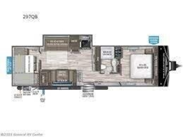A rear private bunkhouse plus a front private bedroom make this the perfect family-friendly trailer. There are two bunks, a residential full bed, plus a dresser and two drawers to store clothes in the bunkhouse. The 42" x 22" rear storage will be great for hiking gear or extra lawn chairs, and you'll find tons of interior storage throughout for all your belongings. Head to the main living area to relax on the tri-fold sofa or booth dinette, or you may just want to visit with the cook outside as they use the outdoor kitchen! There is an LP quick connect, an exterior spray port, a two-burner cooktop, plus a 1.6-cu. ft. exterior refrigerator. Now that's a convenient outdoor kitchen!