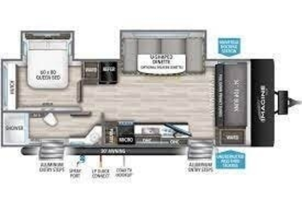 Let your imagination run wild with the possibilities that the Grand Design Imagine XLS travel trailer can provide! The Imagine XLS has been built with oversized tank capacities, an extra-large 2" fresh water drain valve, a ducted A/C system, a power tongue jack, and a heated and enclosed underbelly with suspended tanks. There is a designated heat duct to the subfloor and a residential ductless heating system throughout. For outdoor adventures, the electric awning with LED lights will enable you to stay protected, and the exterior speakers make any time outside a party. You will also love the XLS Solar Package that comes with a 165W roof mounted solar panel, a 40 Amp charge controller, a 12V 10 cu. ft. refrigerator, and roof mounted quick connect plugs!