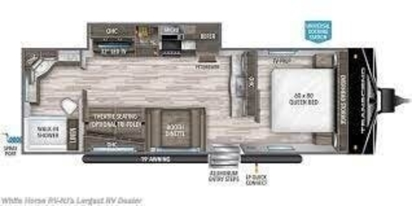 Your search for the perfect couple's trailer is over with this RV in tow! You will enjoy your own private bedroom up front with a queen bed, overhead storage, and TV prep if you choose to bring along your own television. The spacious full rear bath includes a linen closet and a walk-in shower to easily clean up each day. Relax on the theatre seating after a long day outdoors, or you can choose the optional tri-fold sofa if you need additional sleeping space. The booth dinette can also be used for an overnight guest or two little ones. This model also includes plenty of storage space and plenty of counter space to prep and cook at-home meals