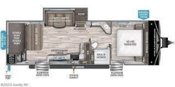 Starting outdoors, you will find conveniences like the detachable power cord, black tank flush, electric awning, and pass through storage. All these combines to make your trip easy and no-hassle.