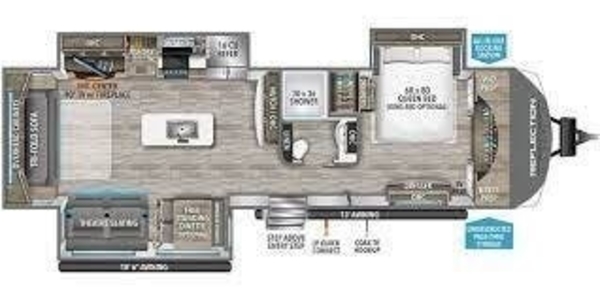 The chef of the group will love the gourmet kitchen including the 16 cu. ft. refrigerator that will hold lots of cold ingredients, beverages and leftovers, the center island when preparing and serving meals, and the hutch with overhead cabinets to display and store dishes and such. This area also includes two slide outs for more floor space and furniture to relax on including theatre seating with cupholders for your drinks, a booth dinette to dine at and work from or choose a free standing dinette option, and a rear tri-fold sofa that offers sleeping space for two at night. There is a 40" LED HDTV with fireplace below to enjoy while inside, plus there are two awnings outdoors to relax under. When you are ready to call it a night, get cleaned up in the full bathroom, and retire to your front bedroom with a slide out queen bed or choose a king option, a front full-wall wardrobe with washer/dryer prep, a dresser and an additional wardrobe with drawers.
