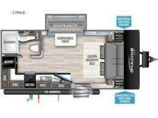 Inside the Imagine XLS 17MKE, you'll find a well-appointed kitchen area complete with a three-burner stove, microwave, refrigerator, and a deep sink. The dinette area is perfect for enjoying meals or playing games, and it can also be converted into an additional sleeping space if needed. The cozy queen-sized Murphy bed at the front of the trailer is easily foldable, allowing you to create more living space during the day. The bathroom is equipped with a shower, toilet, and a sink, providing all the comforts of home while you're on the road.
