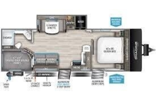The dual entry doors make it easy to enter and exit this travel trailer! You will find a walk-around queen-size bed up front in the private bedroom, and one of the entry/exit doors to the unit so you can quietly slip out for an early morning fishing trip. The U-shaped dinette is right next to the window, so you can look out at your surroundings while you enjoy breakfast. The double-size bunks have some privacy curtains, and the bunks are right next to the full bathroom for easy access in the middle of the night. The fully equipped kitchen has everything you need to get dinner in the oven, and you can have some more prep space by using the flip-up countertop extension. You even have an outdoor griddle and an outdoor 1.6 cu. ft. refrigerator to enjoy a cold beverage while you cook under the 22' electric awning!
