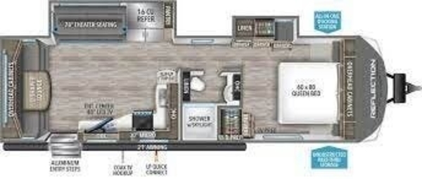 Pack your bags and head out on a comfortable camping trip in this travel trailer! It features a front private bedroom with a queen bed, a set of drawers with an area prepped to add an optional washer and dryer, and a slide that houses a linen closet, a bench, and a wardrobe all with drawers below them. The full bathroom has a shower with a skylight and a linen closet to keep your towels close. The chef can prepare their best home cooked meals with the three burner cooktop, 16 cu. ft. refrigerator, and flip-up countertop extension. Relax on the sofa or the rear U-shaped lounge while you watch a movie with the 40" LED TV at the entertainment center!