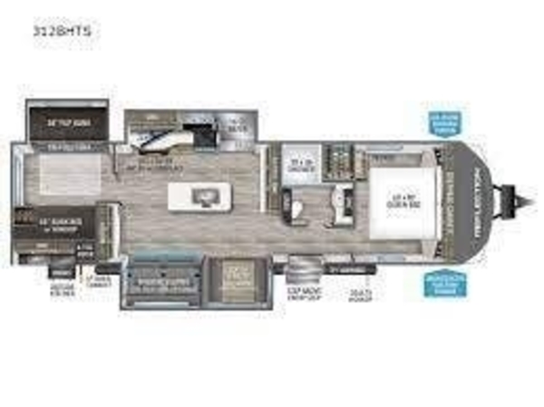 Finding the perfect trailer for a larger group is simple, take a look at this one for your next RV! The rear bunkhouse might be the first reason you fall in love because of the slide out with a flip bunk above a tri-fold sofa, the second bunk bed on the opposite side and storage below, and the large rear window for great views. The outside kitchen might be another reason allowing you to enjoy the outdoors while providing meals for everyone, and/or the inside gourmet kitchen with a 16 cu. ft. refrigerator, an island, and two hutches. Everyone can gather together and relax on the theatre seating with cupholders and the booth dinette or choose a free standing dinette option, and to visit or watch the 40" LED HDTV with fireplace below. The full bathroom includes a space savings sliding door and linen storage, and the bedroom gives you a front walk-around queen bed with storage for your clothes on each side, plus there is an additional wardrobe with drawers and the option to add a washer/dryer to the prepped space.