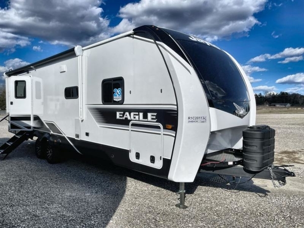 With any Eagle fifth wheel or travel trailer by Jayco you will appreciate durable construction materials, like the Magnum Truss Roof and the Stronghold VBL laminated walls. The JAYCOMMAND Smart RV system puts you in control of your RV's functions, and the 5 Star Handling Package will provide smooth towing from home to camp. Each model features Climate Shield zero-degree tested weather protection and the industry-exclusive HELIX cooling system that features two 15,000 BTU Whisper Quiet A/C's to keep you comfortable year around. Some of the exterior conveniences you are sure to love are the fully enclosed, LED-lit universal docking station, the pass-through storage with Slam-Latch baggage doors, and an automotive style front cap with max turn radius. The Eagle fifth wheels and travel trailers are designed to make you feel at home with solid hardwood slide fascia, residential vinyl flooring, a bathroom skylight, and plenty of storage for all your belongings.