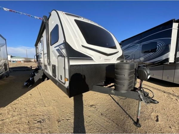 You will experience a smooth flow of traffic in and out of this travel trailer with dual entry doors! The rear private bedroom has one of the entrance/exit doors so you can sneak out for an early morning fishing trip, a queen bed slide for more space, and a wardrobe for your clothes. The full bathroom has a radius shower to clean up in and handy storage areas like a linen closet, a medicine cabinet, and a shelf. Grab a snack from one of the two pantries and head to the theater seating with swivel tables across from the entertainment center for a relaxing movie night. The chef will love cooking in the front kitchen with all of the countertop space and three burner cooktop. It comes standard with a booth dinette, but you can switch it out for the optional table and two chairs with ottoman or the optional table and four chairs.