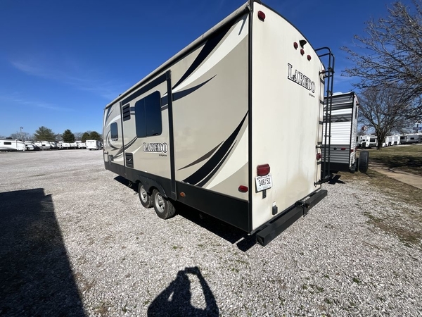 Whether you're hiking up the mountains or fishing on the lake, this Laredo travel trailer is what you need to get you there. You will love the comfort and seclusion that the private bedroom gives you each night, and the two wardrobes are perfect for storing all of your clothing. At the end of the night, if you still haven't gotten enough of that fresh outdoor air, you can gather underneath the 18' awning after roasting marshmallows over the campfire, and you will find the outdoor kitchen to be very convenient when you need an icy cold beverage to wash down those late-night snacks.