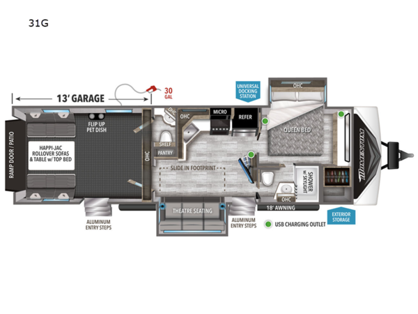 Head out to find new trails in this Momentum G-Class toy hauler travel trailer! Once you remove your dirt bikes from the 13' separate garage, fill them up using the 30-gallon fuel station and start having fun right away! The table with Happi-Jac sofas will allow those who stayed back a place to play cards, or they can head to the main living area to relax on the slide out theater seating. The LED HDTV swivels for a better view, and the kitchen includes all the appliances needed for lunch. The front corner master suite includes a private entrance into the dual-entry full bath, and your guests will appreciate the half bath in the garage!
