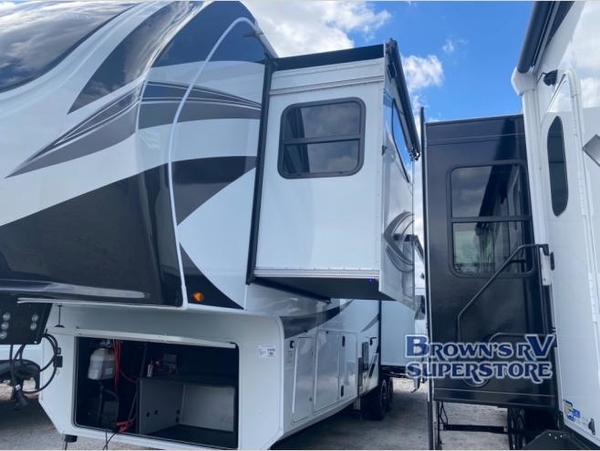 Are you looking to upgrade from a travel trailer to a fifth wheel? If so, this model will be perfect for you! Once you arrive at the campground, you can unload your gear from the pass-through storage, put out the two power awnings, then relax with a cold drink. Inside, you can kick your feet up on the theater seating, play a game at the free-standing dinette, or relax on the tri-fold sofa. The chef of your group will have a kitchen island with a Smart sink, dishwasher prep if you want the option to make cleaning up easier, plus a spacious 20 cu. ft. 12V refrigerator. There is also a 24" residential oven, convenient pull-out trash cans, plus a pantry and a hutch for storage galore! Having two bath sinks in the full bath is sure to be a big convenience when getting ready for bed, and the queen bed slide out (king bed optional) in the front bedroom will provide a great night's rest. You will also find a front wardrobe, a slide-top dresser with an LED TV, plus washer/dryer prep!