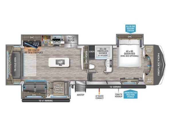 Once inside the Reflection 337RLS you will feel right at home! The LED lighting, spacious solid surface counter tops, and ductless flooring throughout the living area is sure to dazzle. Your eyes will be drawn to the beautiful hand rubbed maple cabinet doors, solid hardwood drawer fronts, and residential style window treatment. The kitchen is complete with a deep farmers stainless-steel kitchen sink with hi-rise faucet and pullout sprayer built in to the large kitchen island, a residential style microwave, and a large pantry. This particular fifth wheel comes with the free-standing table and chairs in place of the booth dinette as well as a 12-cu foot Refrigerator!