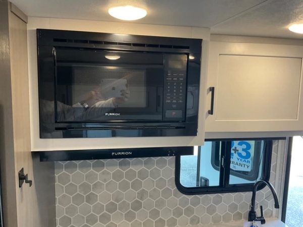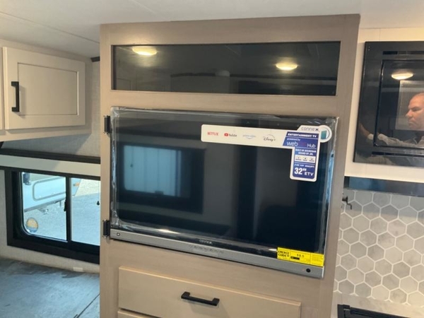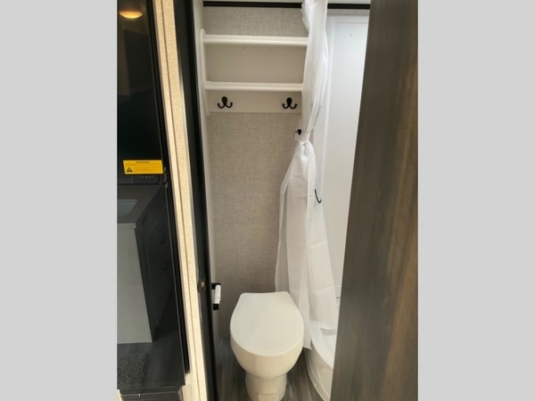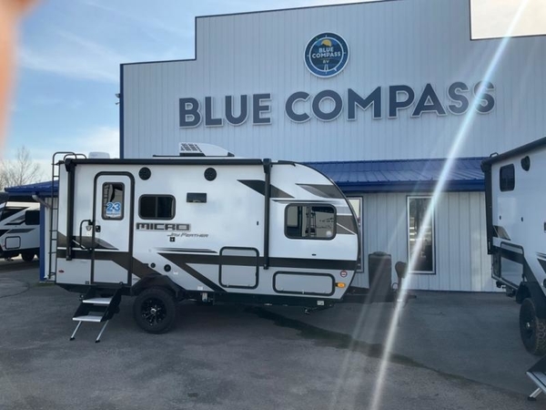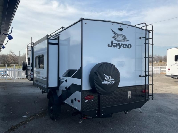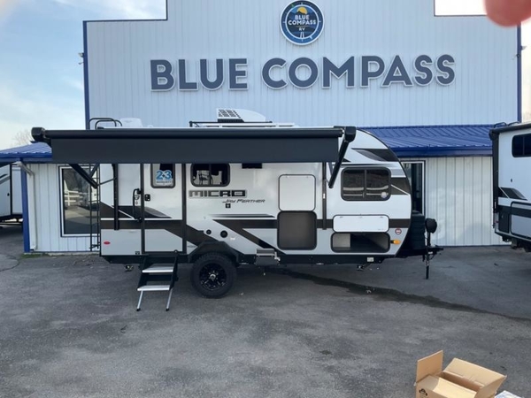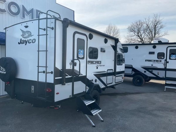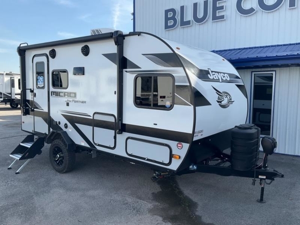 Jayco's lightest travel trailer, the Jay Feather Micro is ready for adventure at the drop of a hat! The Climate Shield weather protection will let you camp well into the colder months and the Stronghold VBL with double-sized Azdel is ultra durable. The Jay Pro Package includes 16-inch American-made Goodyear off-road tires with self-adjusting brakes, a rear-mounted roof ladder, and the Overlander 1 Solar Package with a 200W solar panel. Additional exterior features include marine grade exterior speakers with blue LED accent lighting, a swing-out entry door assist handle, a power tongue jack, and more! Inside, you will love the 4-inch high-density dinette cushions with vinyl backing for easy cleaning, along with the handcrafted hardwood door/drawer fronts, residential style kitchen countertops, and decorative roller shades with a reflective barrier for better insulation.