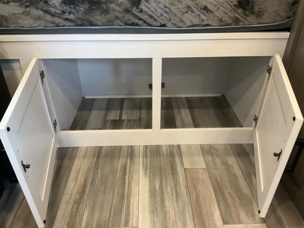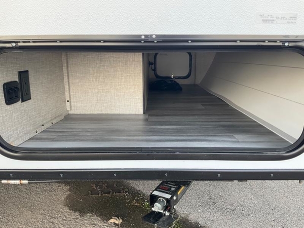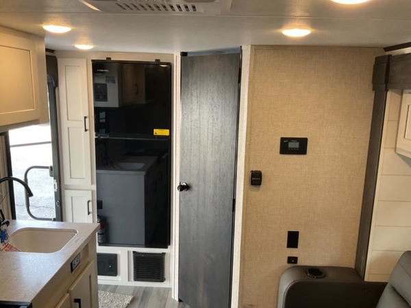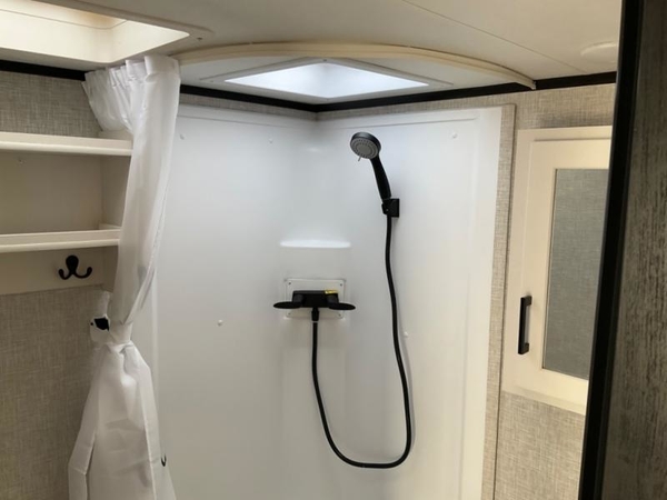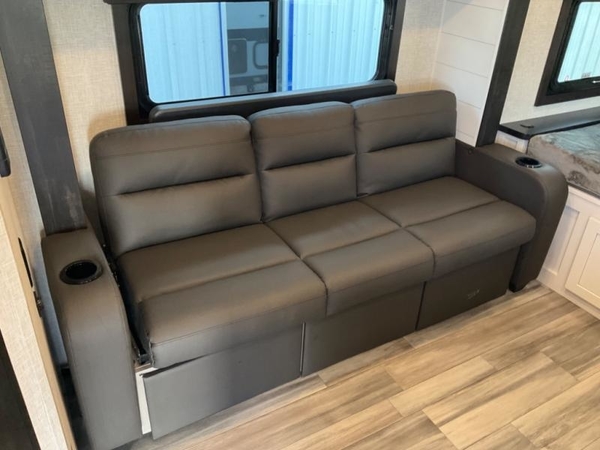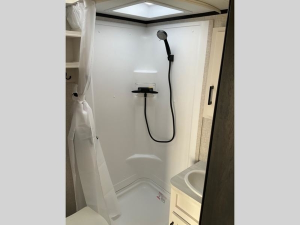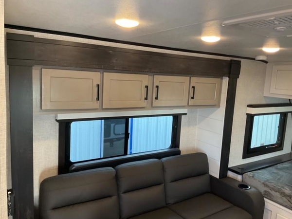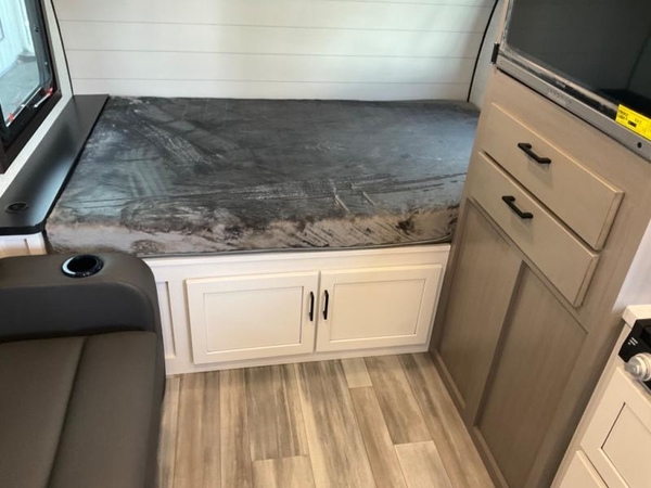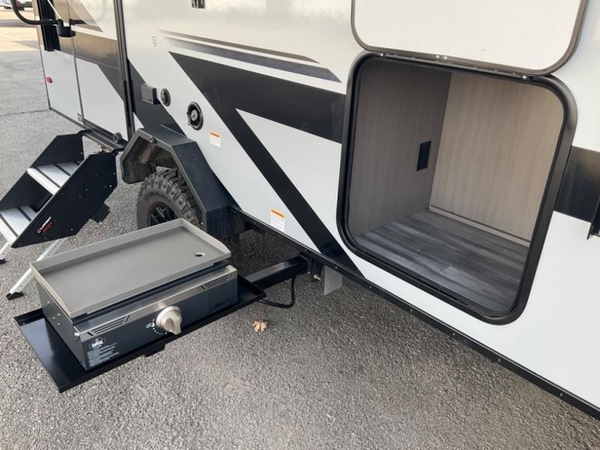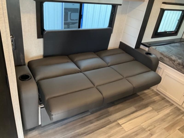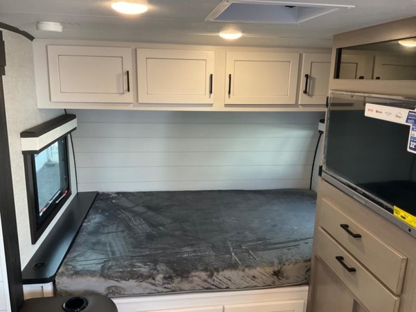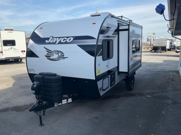 Weekends at the lake are made comfortable in this single slide out travel trailer. You will enjoy your own 54" x 80" front bed so you don't have to sleep on the floor, plus there is a jack-knife sofa if you have an overnight guest. The full bath features a radius shower with a skylight, plus plenty of storage space for your medicines and toiletries. This model includes a microwave oven and a three burner cooktop to prepare meals each day, and an 10 cu. ft. 12V refrigerator for perishables. You will also find an exterior refrigerator for cold drinks, plus an outside griddle for the JayPort system!