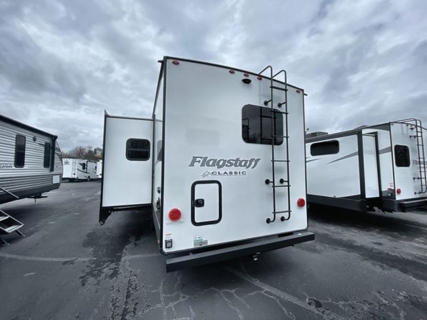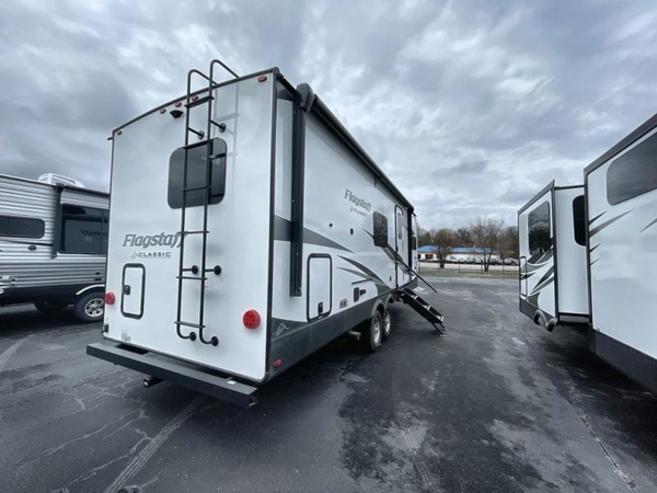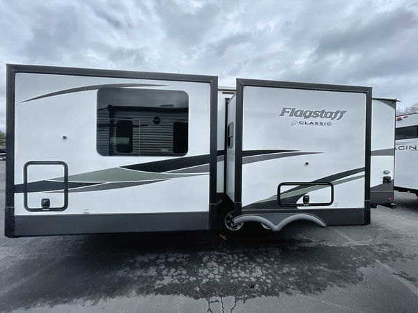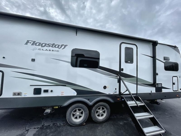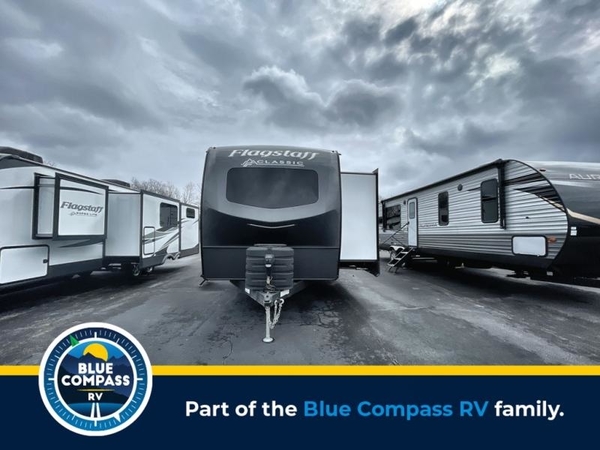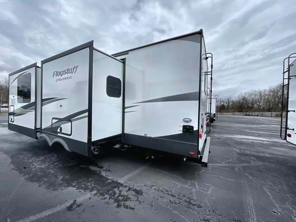 Each one of these Forest River Flagstaff Classic fifth wheels or travel trailers will be your home on wheels! Their quality craftsmanship and attention to detail shines through the surface-coated steel I-beam frame on fifth wheels, the enclosed underbelly, the radius roof with vaulted interior ceilings, and six-sided fully aluminum-framed floor, walls, and roof. Towing your unit will be easy with the torsion axle, Rubber-Ryde suspension, and nitrogen-filled Goodyear Endurance tires. You will even reduce your use of water with the Showermiser water saving system in the bathroom. A few other convenient features you will enjoy include a control panel with WeRV app control, a designer headboard and bedding, and an outside shower with hot and cold water. Come choose your favorite one today!