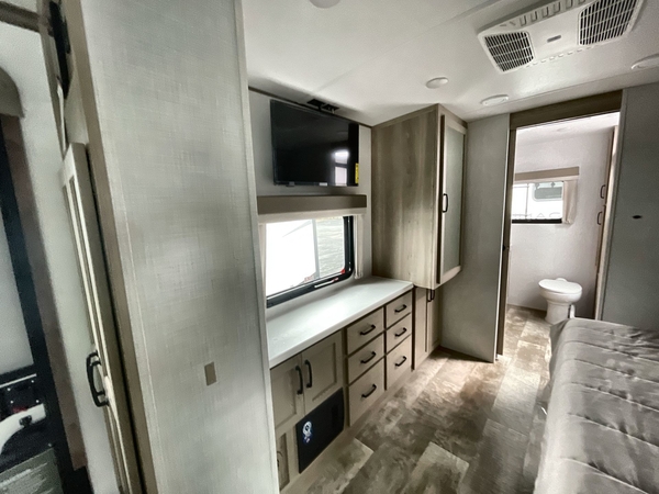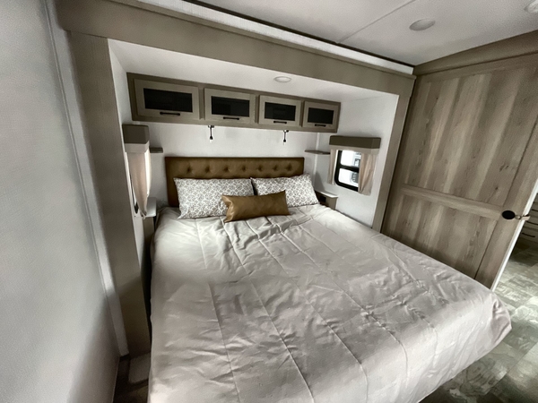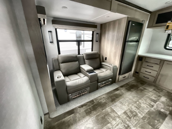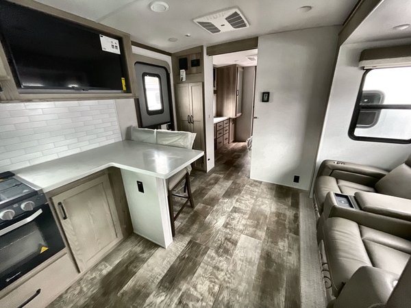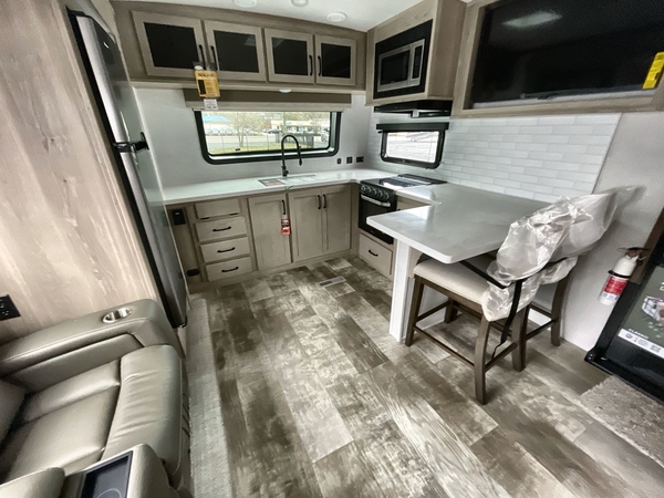 You will love how open this travel trailer will feel with the large front window that you can look out from the two-person bar top seating! The front kitchen has plenty of countertop space for you to prepare your best meals. Your nights will be spent in true relaxation with a 67" theater seating and king bed slide in the bedroom for a great night's rest. The full rear bathroom has a shower with a seat to take a nice, hot shower before bed, and a dual-sink vanity for two to get ready at once in the mornings!