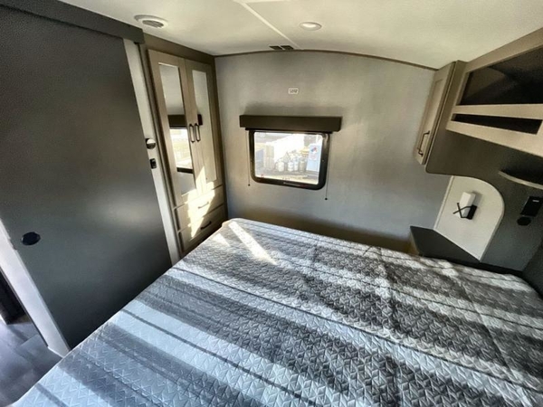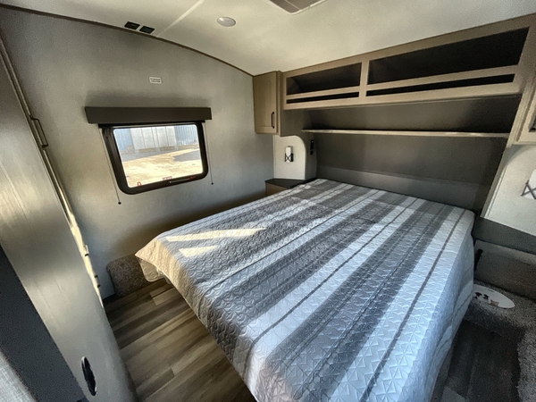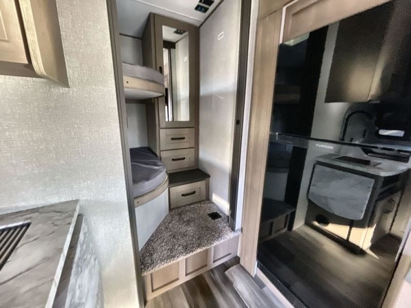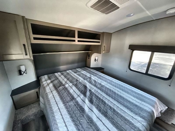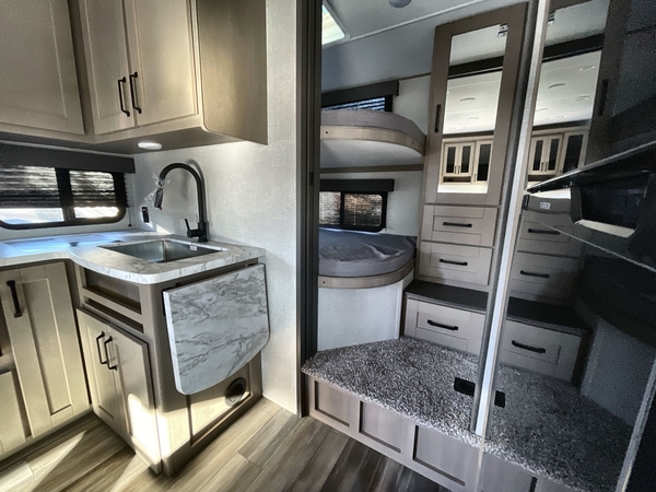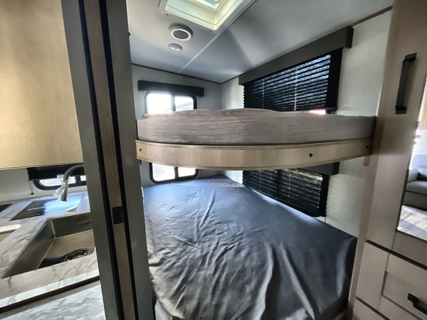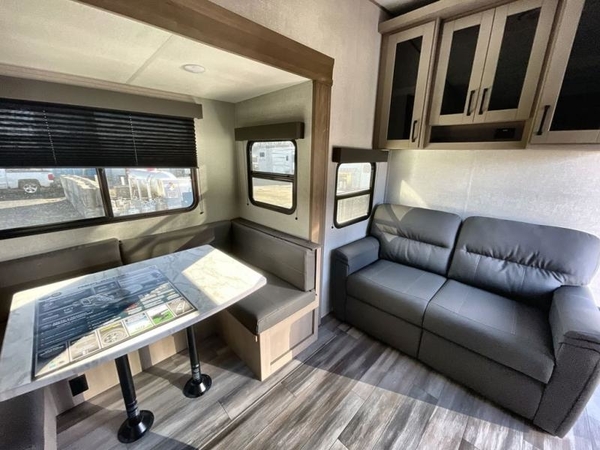 Camping with friends and family just got a whole lot easier in this fifth wheel with double-size bunks and a front private bedroom. Your guests will also have a  wardrobe and step storage to keep their things tidy, and the bedroom closet will be perfect for your things. If you have other guests stay over, they can sleep on the U-shaped dinette within the slide out or the tri-fold sofa, and there is a 40" high-definition LED TV here to keep everyone entertained on rainy days. Everyone can take turns cleaning up in the full bath that includes a residential walk-in shower, a power vent fan, plus a large vanity top with a deep sink. And you will feel right at home in the front private bedroom with its queen bed, overhead cabinets, and TV prep if you'd like to add a television!
