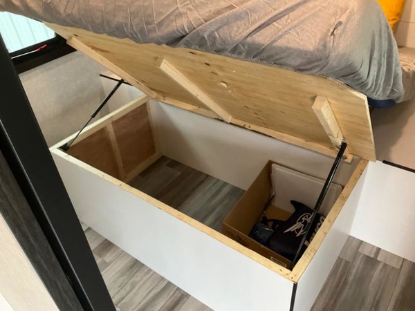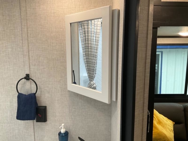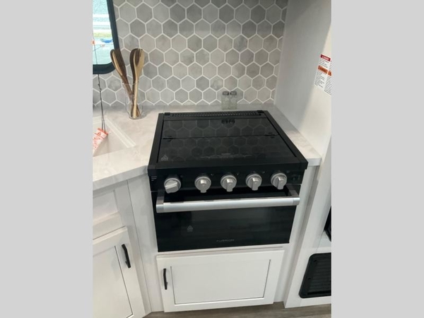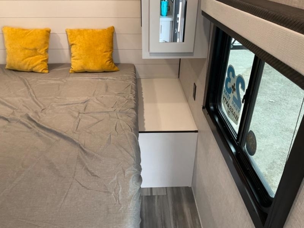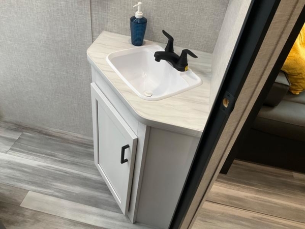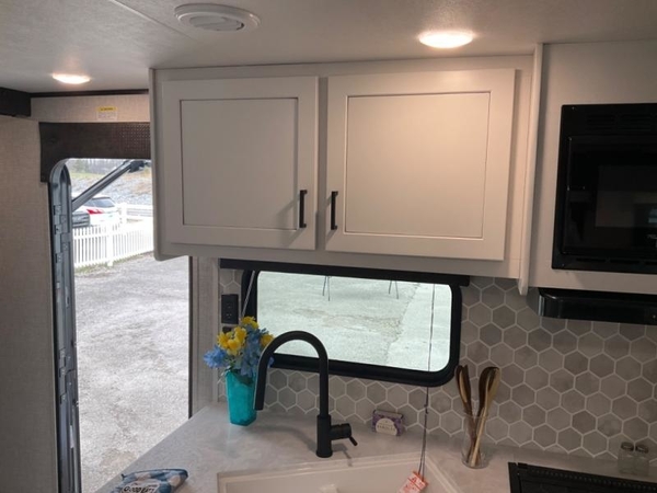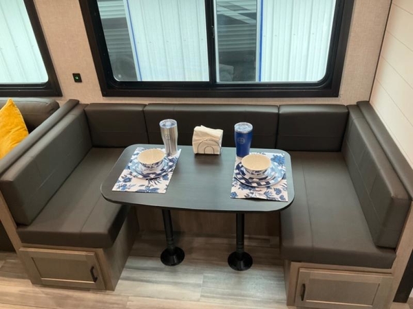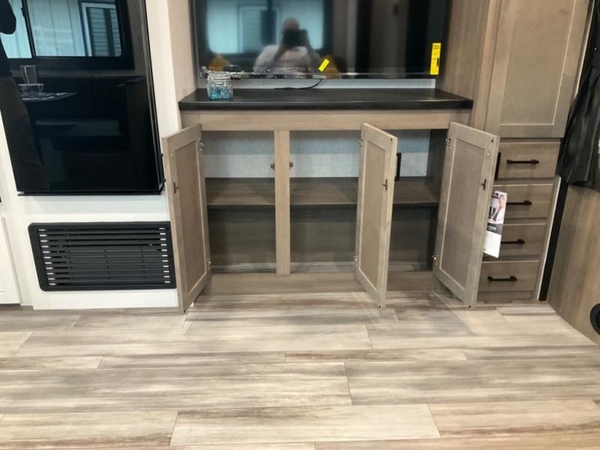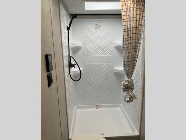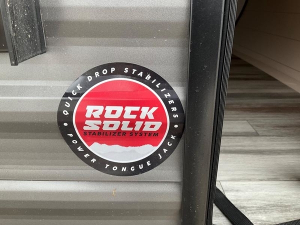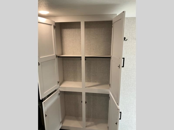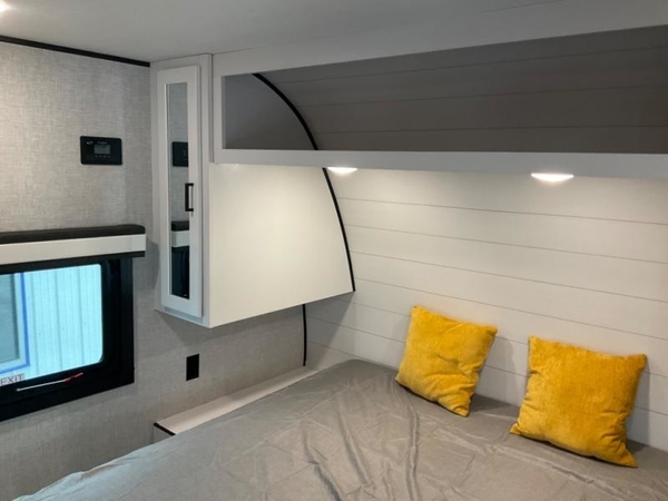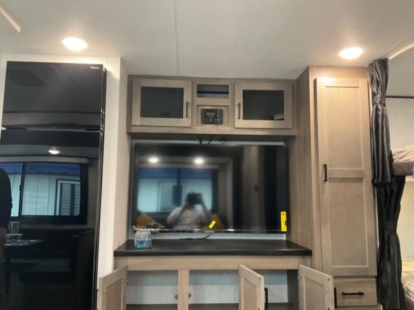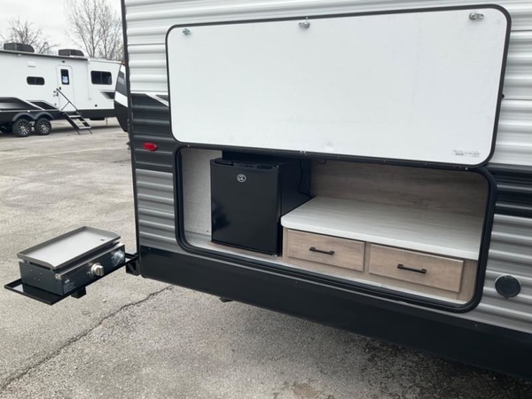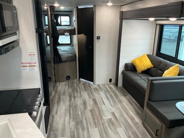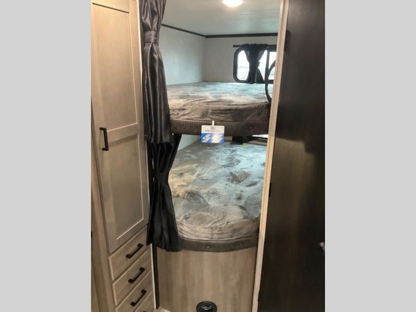 Loads of fun like hiking, fishing, and playing outdoor camping games are waiting for you to make that reservation, hitch up and head out! This trailer allows the owners to sleep in privacy behind the space saving sliding door on a 60" x 75" queen bed. And the kids or grandkids can sleep on the double size bunks in the rear next to the full bathroom including a tub/shower. They even have a wardrobe nearby for their things. The slide out jackknife sofa and U-shaped dinette offers more floor space, a place to relax and dine, plus you can play games at the dinette. The kitchen includes full amenities at your fingertips, plus you all can enjoy the entertainment center with TV when inside. When you want to be outdoors, relax under the 16' power awning after grabbing your camping chairs, and you can grab a beverage from the outside fridge!