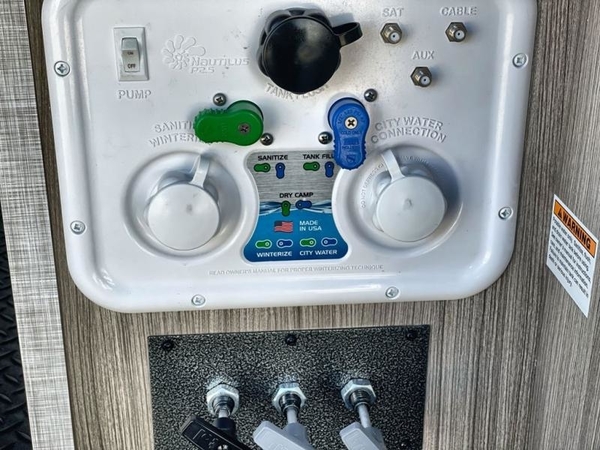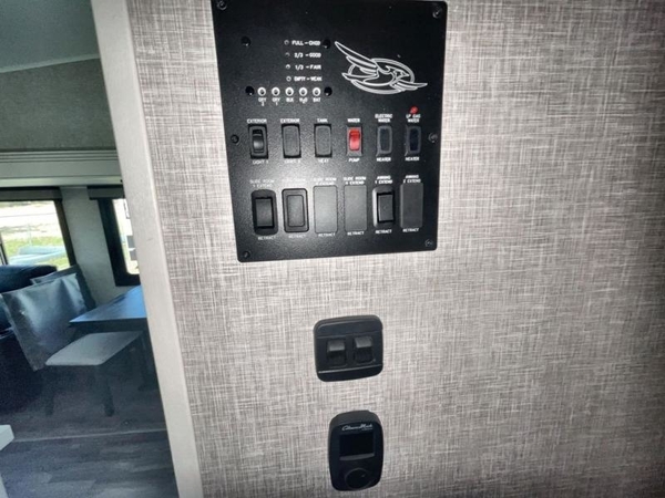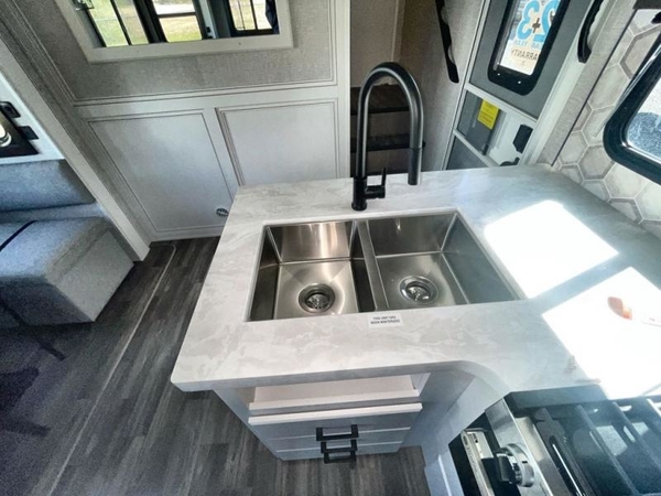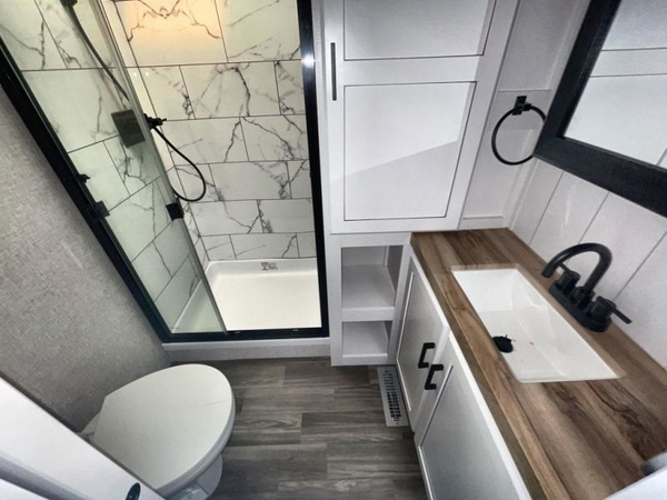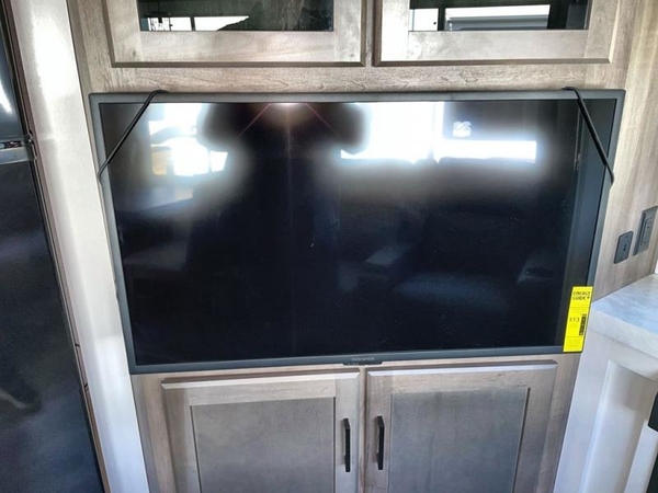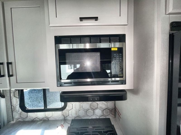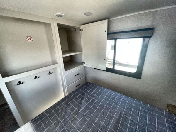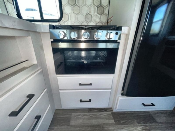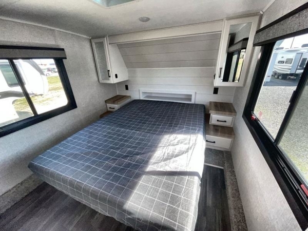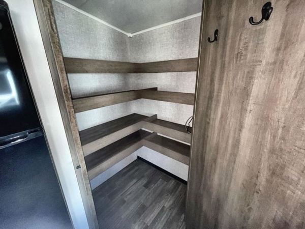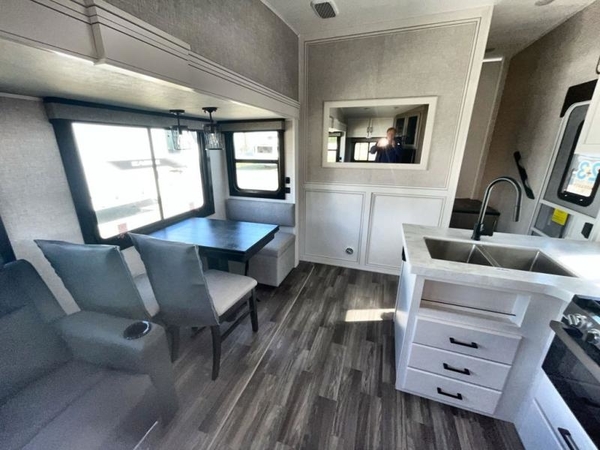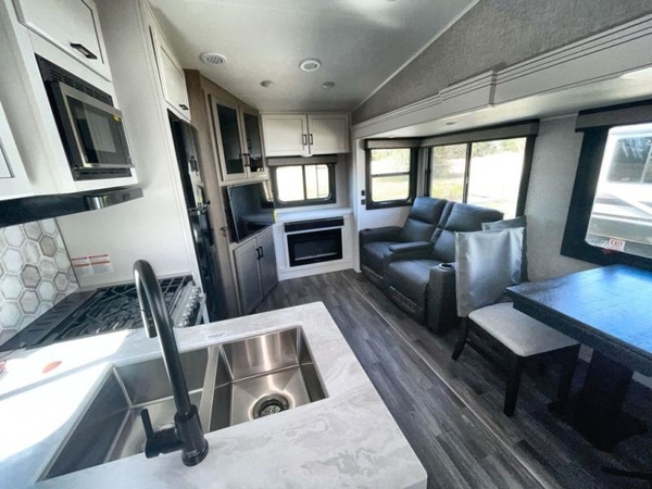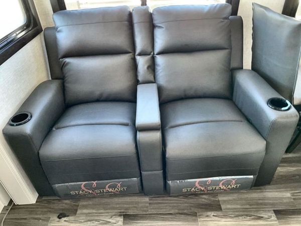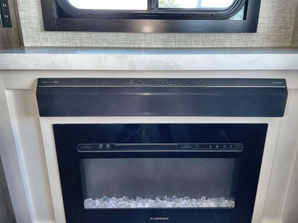 This is the perfect couple's fifth wheel since it features sleeping space for two up front! You can use the dual bedroom wardrobes to store your clothes in, and the full bath is close by so you can get ready each morning. After you've whipped up breakfast in the kitchen, you can dine at the table and chairs with bench seating, then relax with your coffee on the theater seat. There is an entertainment center across from the sofa for convenience, plus a hidden walk-in pantry behind the TV. You might even like to add the fireplace option to make it feel more like home!