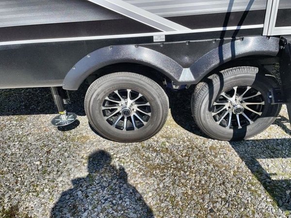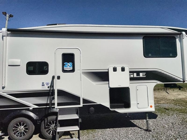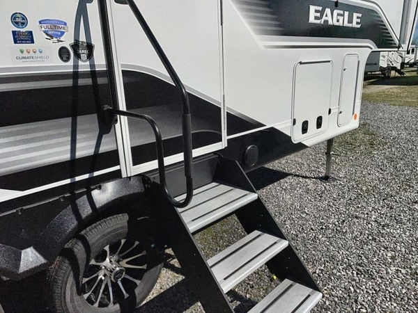 With any Eagle HT fifth wheel by Jayco you will enjoy a smooth drive thanks to the 4 Star Handling Package, Goodyear Endurance tires, and MORryde CRE-3000 rubberized suspension. The Customer Value Package includes amenities that are sure to make camping easier than ever, like the 60K on-demand water heater, Keyed-Alike lock system, electric awning with integrated LED lights, and more. Handcrafted and glazed door/drawer fronts will make your space feel more like home, along with residential vinyl flooring throughout, motion activated LED lights, and blackout roller shades with reflective side throughout to keep the sun out when you want to sleep in. The HELIX Cooling System features Jayco's exclusive insulated dual duct design, directional and closeable A/C vents, and larger return air vents with user friendly filters to keep your crew comfortable all summer long. Choose an entry-level Eagle HT fifth wheel today!