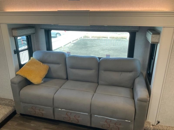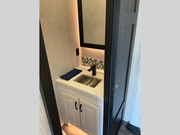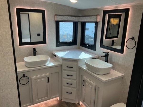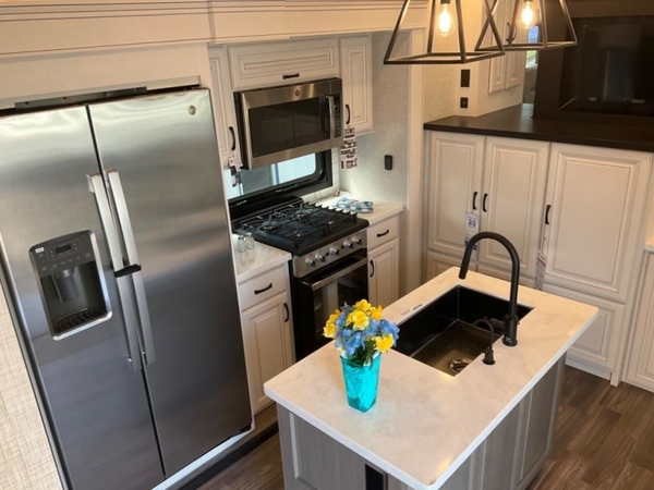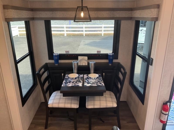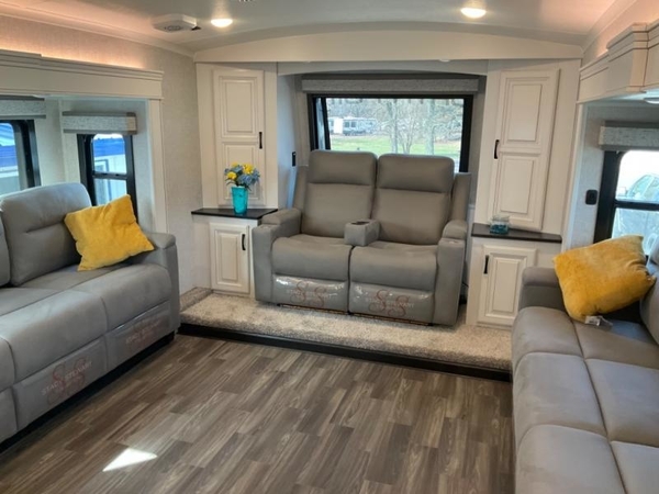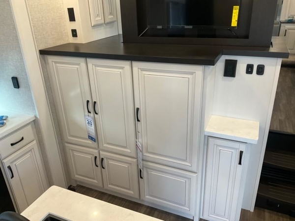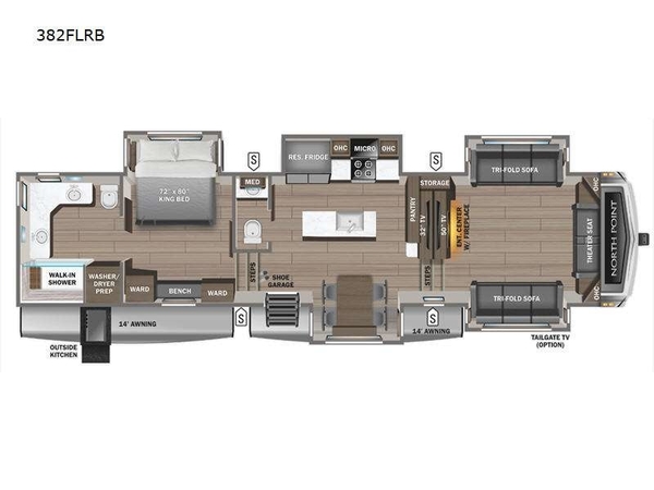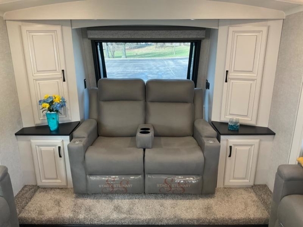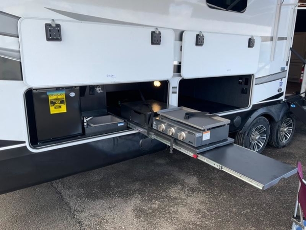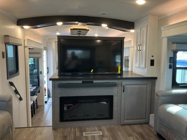 Entertainment can be found throughout this fifth wheel from the front living area with a 50" Smart LED HDTV with fully digital HDMI output and home entertainment system with subwoofer including a fireplace below that you can enjoy while relaxing on theater seats and two tri-fold sofas, a 32" TV in the middle kitchen and there is a bedroom 32" TV. You might even like to add the tailgate TV option along the exterior. Back inside the kitchen, the cook will love the center island, the pantry, the 21 cu. residential refrigerator or choose the 18 cu. ft. option, and the free standing table with a leaf, two free standing chairs and two folding chairs. The half bath is a few steps away as an added convenience. The master bedroom includes a king bed slide, a bench, two wardrobes and a sliding door into the bathroom which offers two sinks, a space prepped for a washer/dryer option, and a walk-in shower. And don't forget about the exterior features such as the outside kitchen for more choices when making meals, the storage for your outdoor gear and chairs, and two awnings with integrated LED lighting.