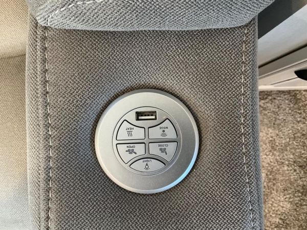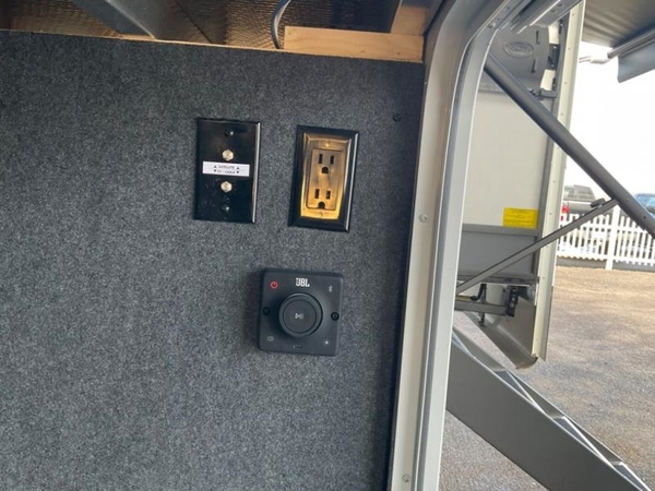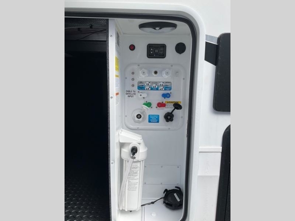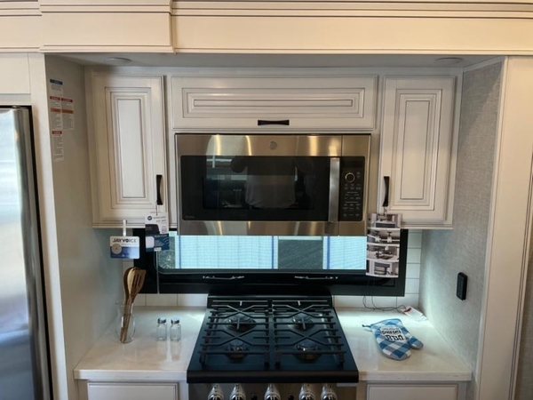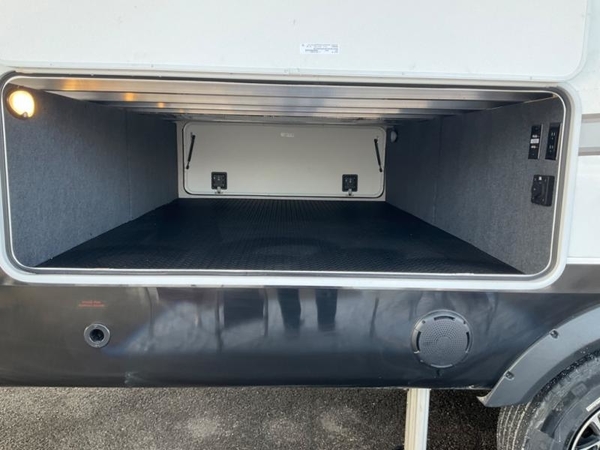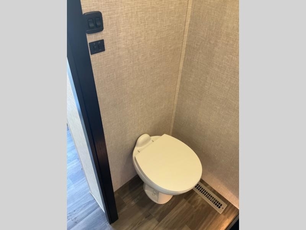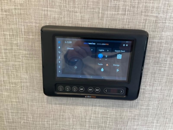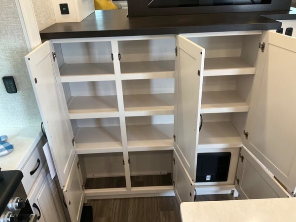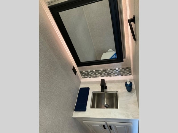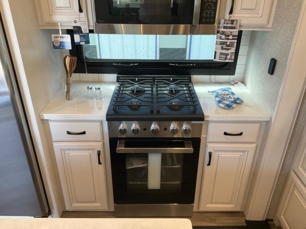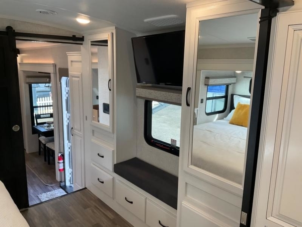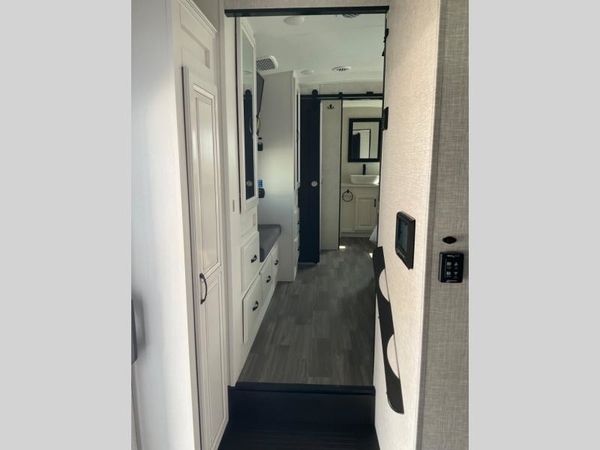 Entertainment can be found throughout this fifth wheel from the front living area with a 50" Smart LED HDTV with fully digital HDMI output and home entertainment system with subwoofer including a fireplace below that you can enjoy while relaxing on theater seats and two tri-fold sofas, a 32" TV in the middle kitchen and there is a bedroom 32" TV. You might even like to add the tailgate TV option along the exterior. Back inside the kitchen, the cook will love the center island, the pantry, the 21 cu. residential refrigerator or choose the 18 cu. ft. option, and the free standing table with a leaf, two free standing chairs and two folding chairs. The half bath is a few steps away as an added convenience. The master bedroom includes a king bed slide, a bench, two wardrobes and a sliding door into the bathroom which offers two sinks, a space prepped for a washer/dryer option, and a walk-in shower. And don't forget about the exterior features such as the outside kitchen for more choices when making meals, the storage for your outdoor gear and chairs, and two awnings with integrated LED lighting.