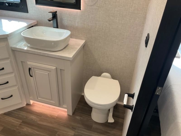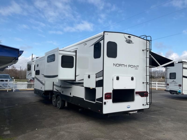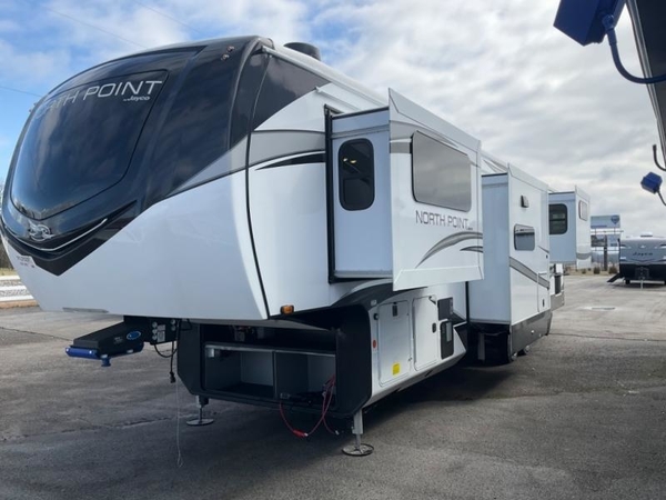 With any North Point fifth wheel by Jayco you begin with a strong foundation with a custom frame, designed and sized specifically to best support each unit. Constructed with Stronghold VBL aluminum framed, vacuum bond laminated walls and the Magnum Truss XL6 roof system with a one-piece, seamless roof material which is the strongest tested roof in the industry. The 5-Star Handling package is included with Uniroyal tires, a MORryde rubber pin box, Dexter axles with Nev-R-Adjust brakes, MORryde CRE-3000 rubberized suspension and wet bolt fasteners and bronze bushings. The interior has handcrafted hardwood glazed doors and drawers, vinyl flooring throughout, a vessel bowl sink with high rise faucet in the main bathroom, plus so much more you just have to see one to believe it all!