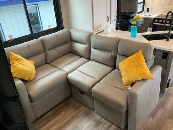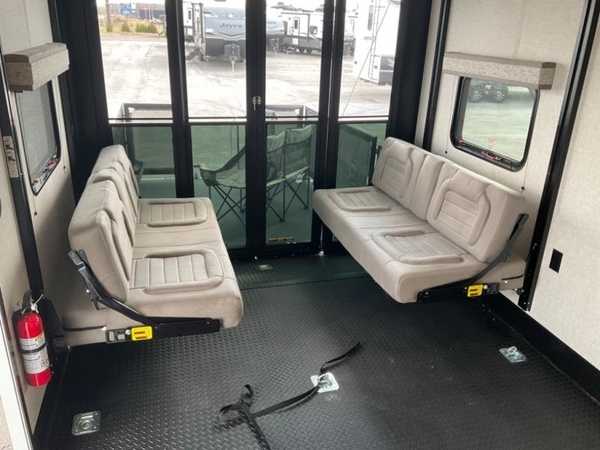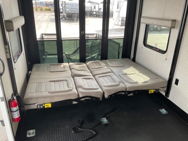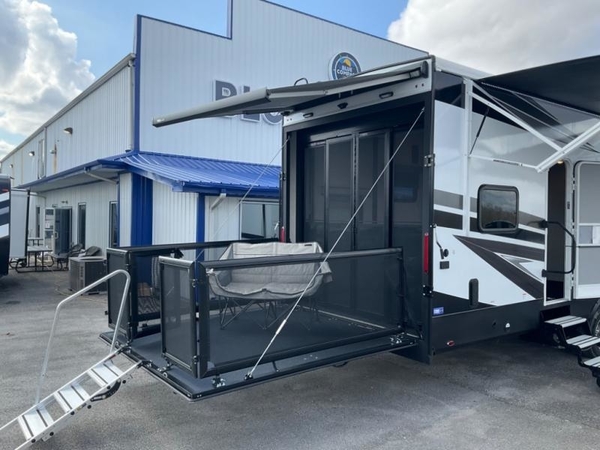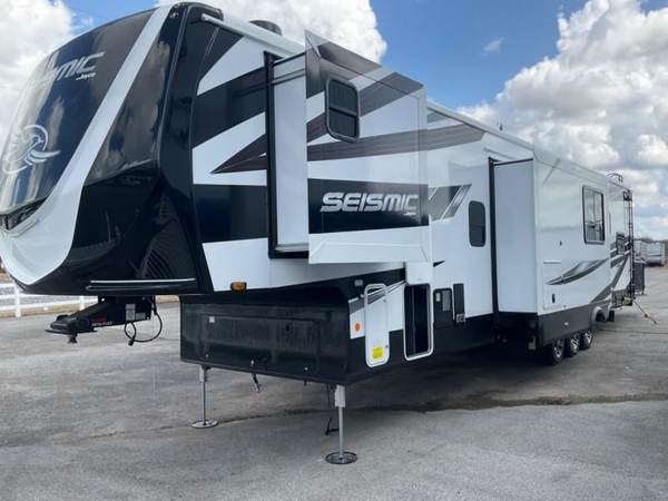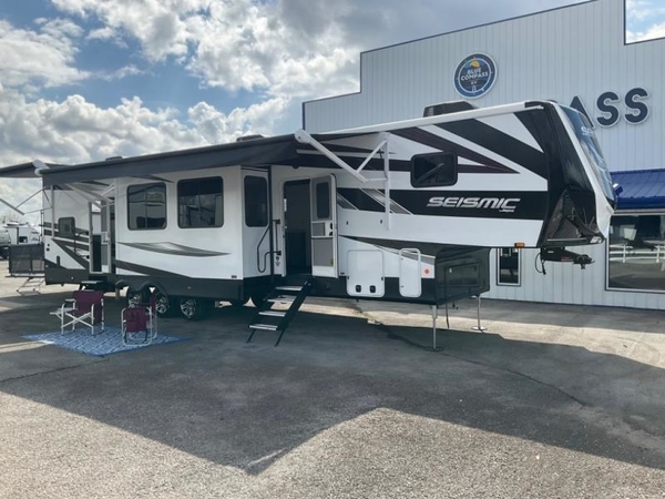 Take your outdoor adventures up a notch with this Seismic toy hauler. You can take the whole gang along for some fun with triple slides and dual entry for easy access going in and out. Your friends will sleep comfortably on the convertible sofas with overhead queen bed above in the 14' cargo garage space. There is also a storage space/loft above for their things and additional sleeping if needed. Inside, a full bath can be shared by all to get cleaned up each day, and all can gather inside in the spacious living area featuring dual opposing slides. Theater seating and an L-shaped tri-fold sofa creates plenty of space for lounging and there is also a dining table for four inside and the second table in the garage area also allows for more seating during meals inside when the weather isn't that nice. A side awning provides protection from the elements just outside the main door, plus the rear ramp party deck with steps and awning creates even more outdoor living space to enjoy!