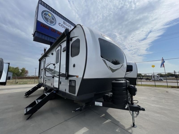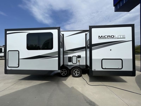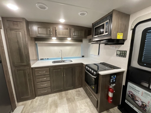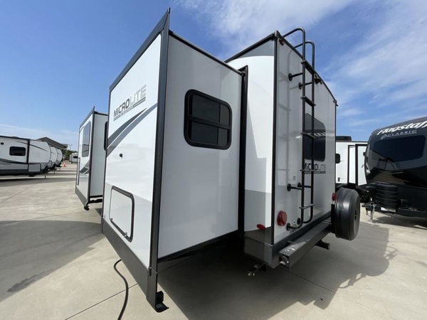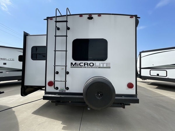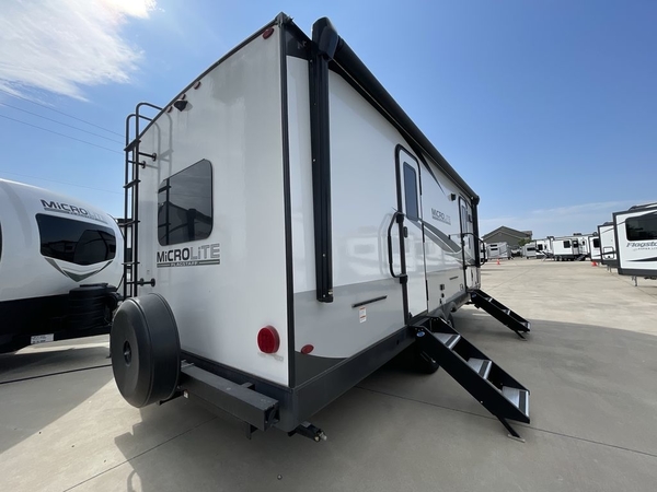 With any Flagstaff Micro Lite travel trailer by Forest River you will enjoy lightweight towing, durable construction, and added interior comforts to make each trip memorable! Each model features a torsion axle, Rubber-Ryde suspension, nitrogen filled, Goodyear Endurance tires, and easy lube axles with Nev-R-Adjust brakes for smooth towing from home to campground. The 6-sided aluminum framed construction provides a strong foundation so you can enjoy your RV for years to come, plus electronically controlled heated holding tanks and an enclosed underbelly will let you camp all year long. Head inside to find hybrid woven flooring in the slide outs, Sedona wood cabinetry, solid surface kitchen countertops, and many more amenities. These travel trailers also include exterior conveniences for hassle-free camping, like the power tongue jack, magnetic compartment door catches, Keyed Alike locks, and rear ladder to name a few!