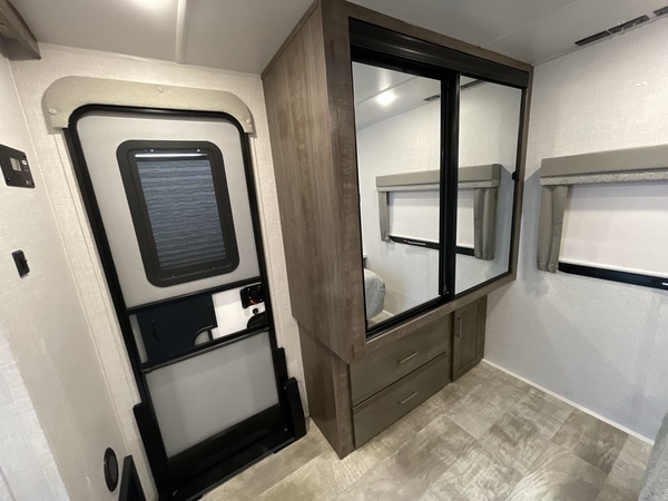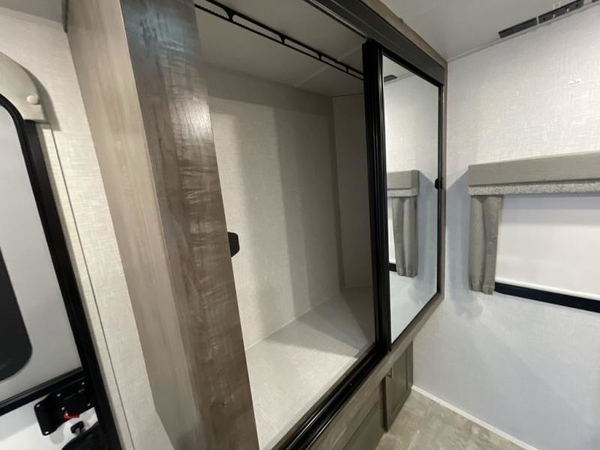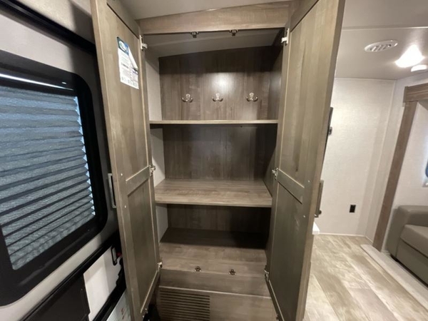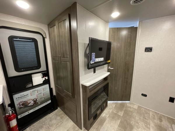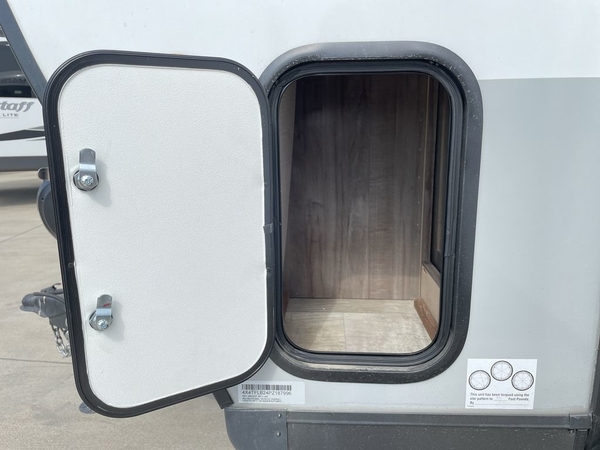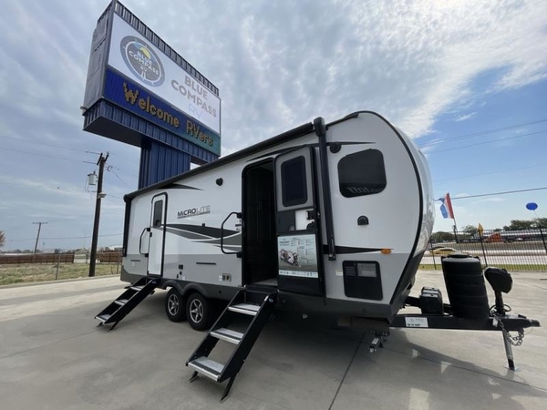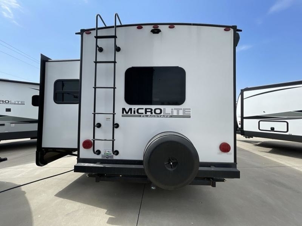 This Flagstaff Micro Lite travel trailer is going to make your camping dreams come true! With a queen bed slide and a large wardrobe in the private bedroom, you will have all that you need for sleeping and storing your belongings. Plus, the second exterior entry door leads right into the bedroom so that you can escape for an early morning run without running through the entire trailer to get outside. The front kitchen is open and accommodating with its helpful tools, and the 67" theater seat is right next to the 12V refrigerator on the slide out. Right next to the front entry door is a coat closet/pantry so you can keep your jackets readily available, and there is also a linen closet in the walk-through bath so that you can keep your towels ready for your shower.