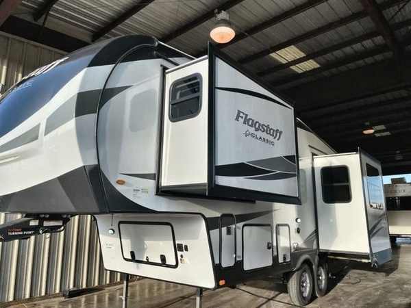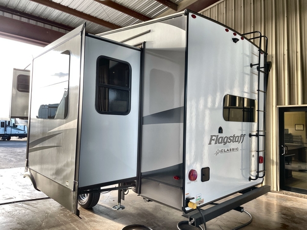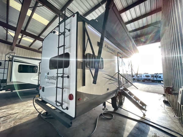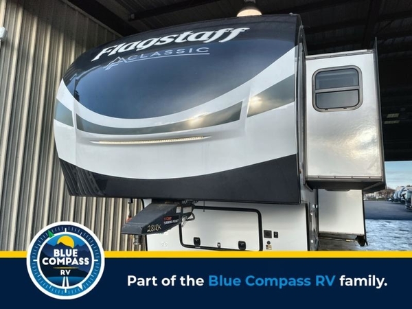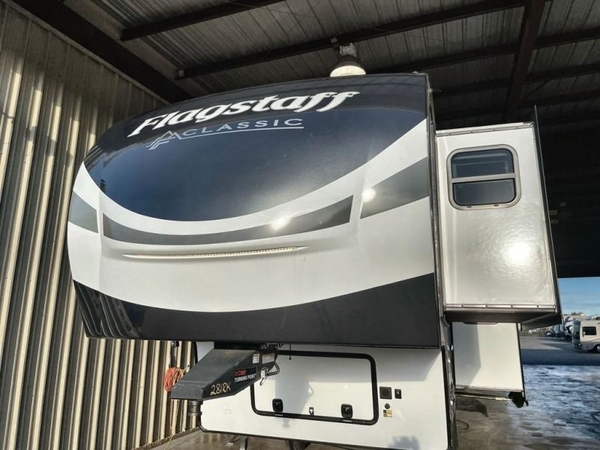 Each one of these Forest River Flagstaff Classic fifth wheels or travel trailers will be your home on wheels! Their quality craftsmanship and attention to detail shines through the surface-coated steel I-beam frame on fifth wheels, the enclosed underbelly, the radius roof with vaulted interior ceilings, and six-sided fully aluminum-framed floor, walls, and roof. Towing your unit will be easy with the torsion axle, Rubber-Ryde suspension, and nitrogen-filled Goodyear Endurance tires. You will even reduce your use of water with the Showermiser water saving system in the bathroom. A few other convenient features you will enjoy include a control panel with WeRV app control, designer headboard and bedding, and an outside hot and cold water port. Come choose your favorite one today!