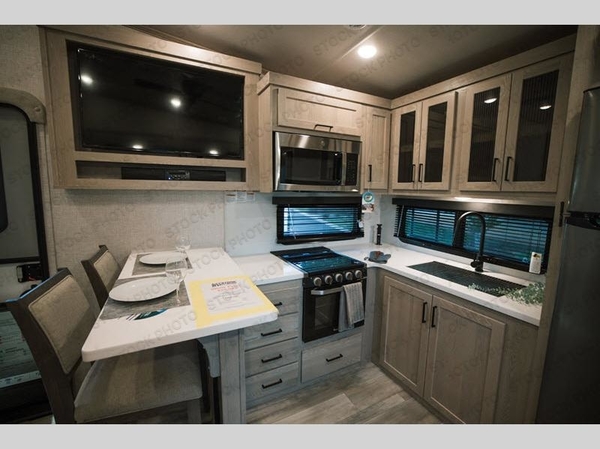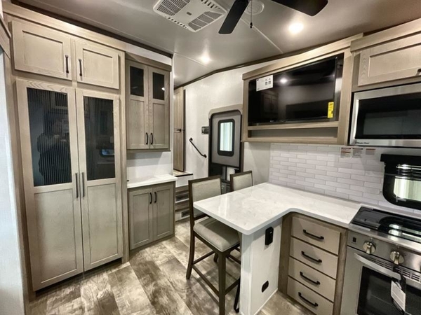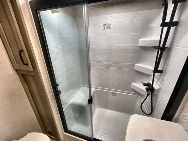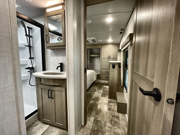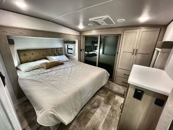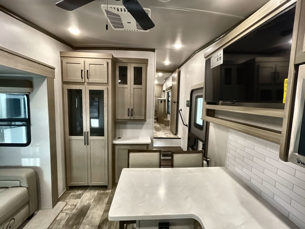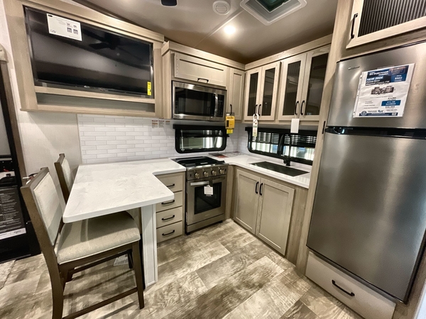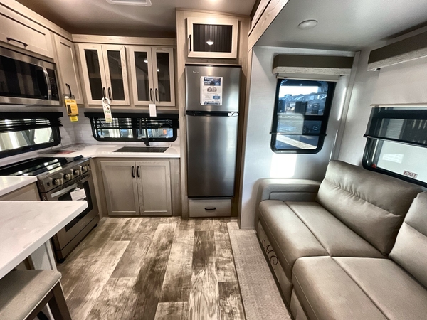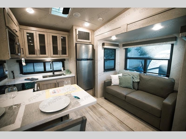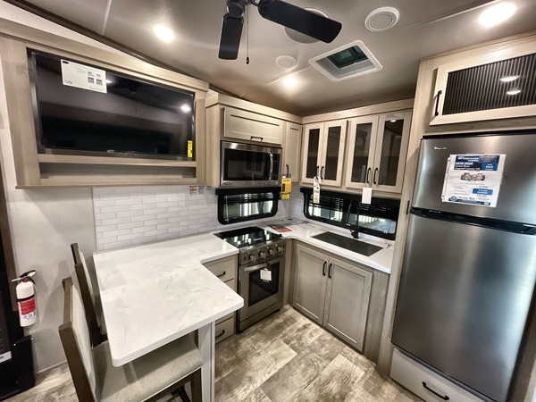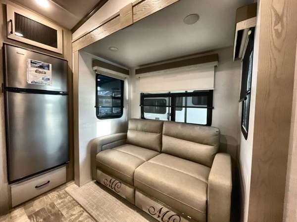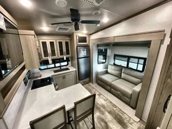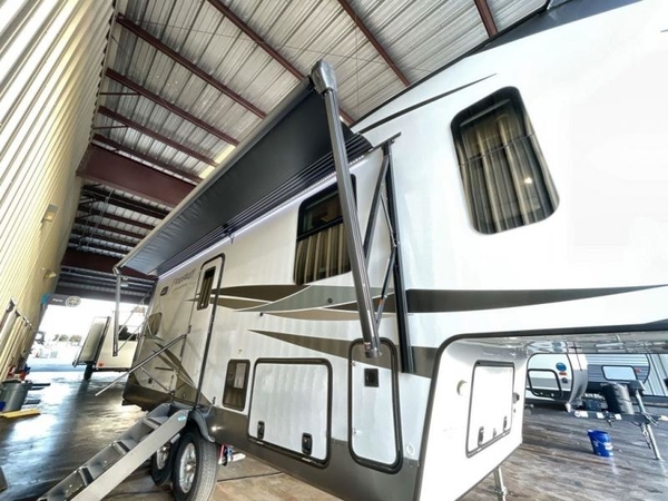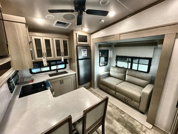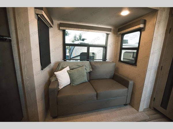 Camp in comfort with your favorite person or your friends in this spacious bedroom and bathroom fifth wheel! From the shower with a seat and linen storage to the slide out queen bed or choose a king option, you will feel right at home. The bedroom also offers a dresser, a front wardrobe with shelves, and an optional TV. The main living area provides a hide-a-bed sofa that sleeps two, a rear kitchen with a 11 cu. ft. refrigerator to store lots of food, and a bar top with seating to dine at. You can watch the Smart TV before going to bed or each morning, and the 20' awning gives you even more living space outdoors protected from the outside elements.