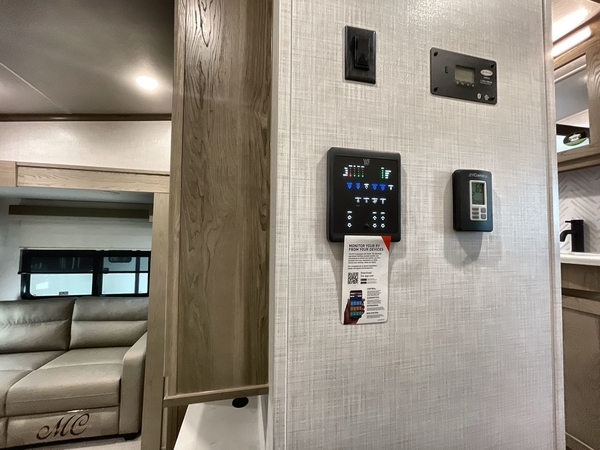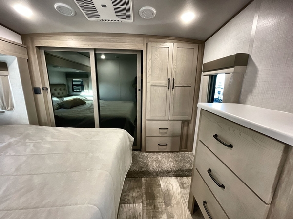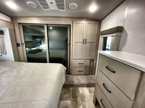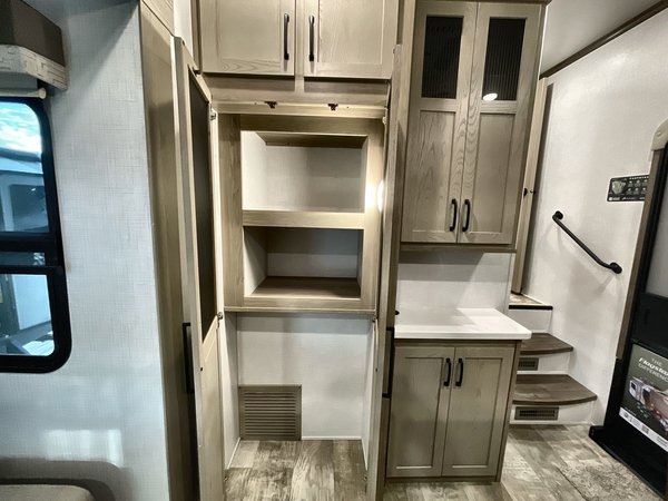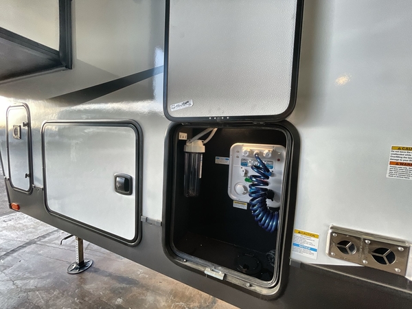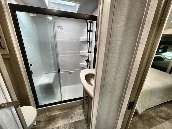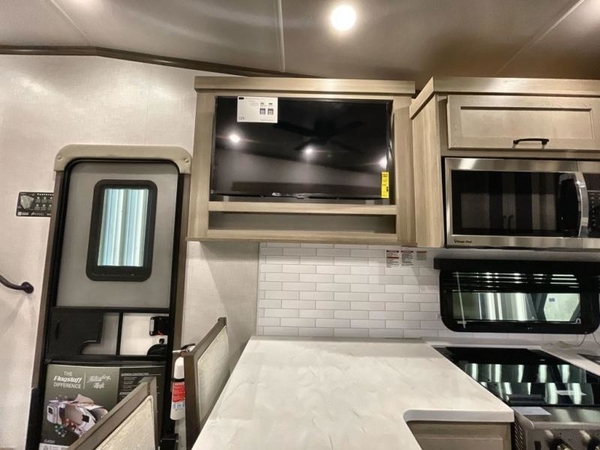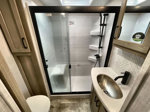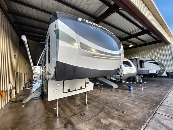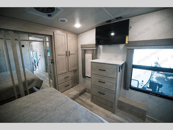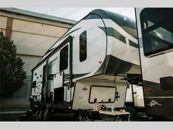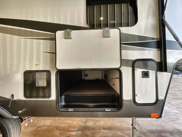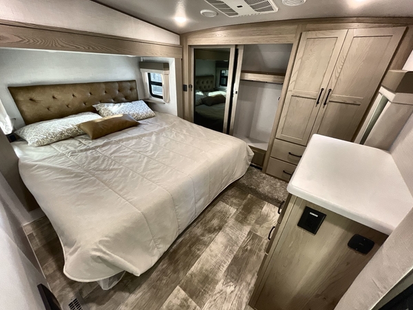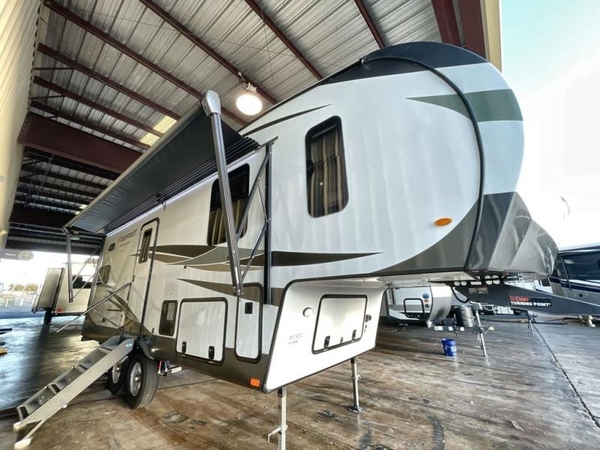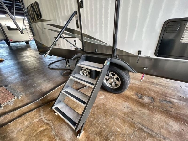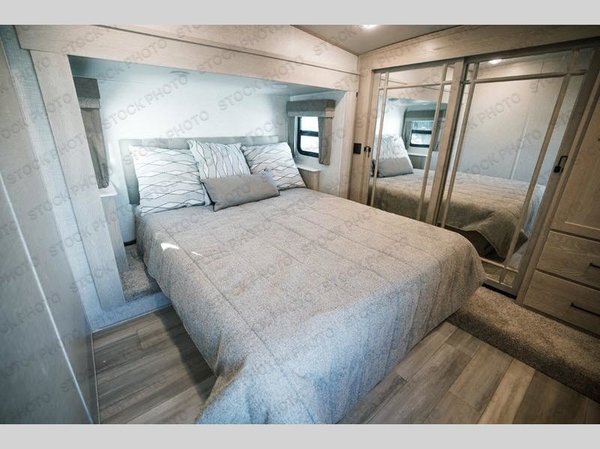Camp in comfort with your favorite person or your friends in this spacious bedroom and bathroom fifth wheel! From the shower with a seat and linen storage to the slide out queen bed or choose a king option, you will feel right at home. The bedroom also offers a dresser, a front wardrobe with shelves, and an optional TV. The main living area provides a hide-a-bed sofa that sleeps two, a rear kitchen with a 11 cu. ft. refrigerator to store lots of food, and a bar top with seating to dine at. You can watch the Smart TV before going to bed or each morning, and the 20' awning gives you even more living space outdoors protected from the outside elements.