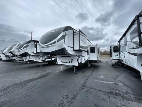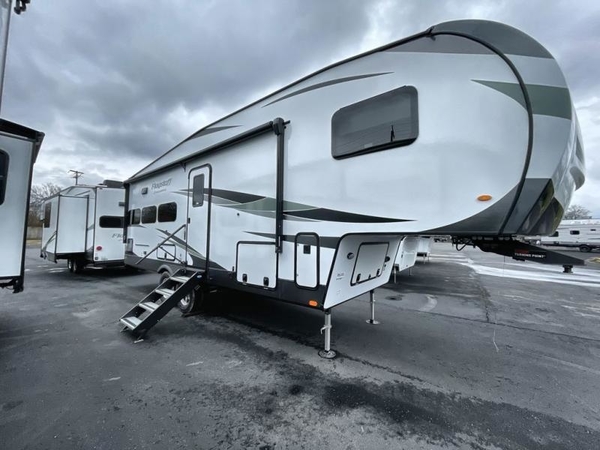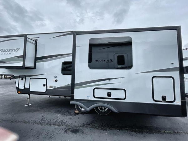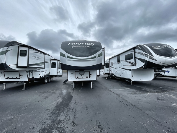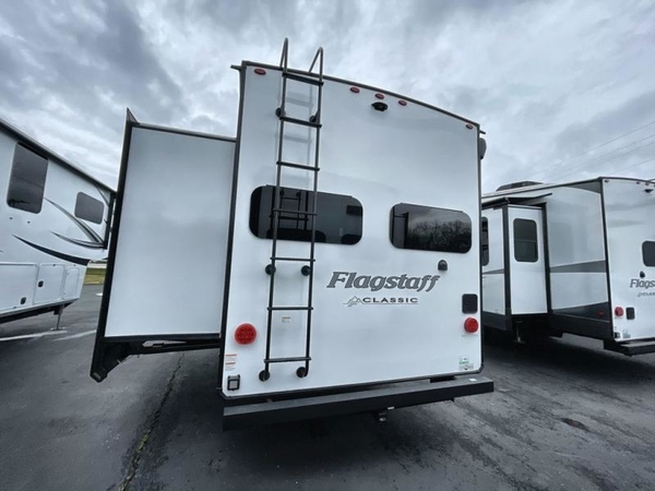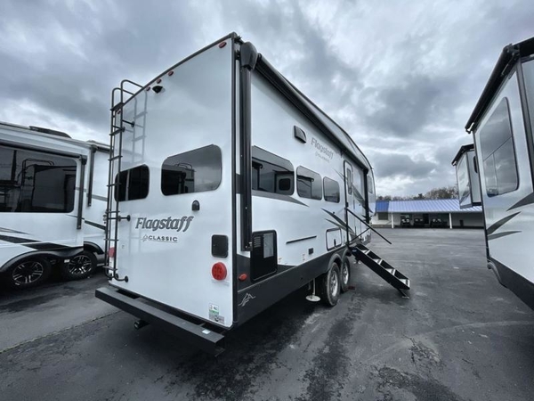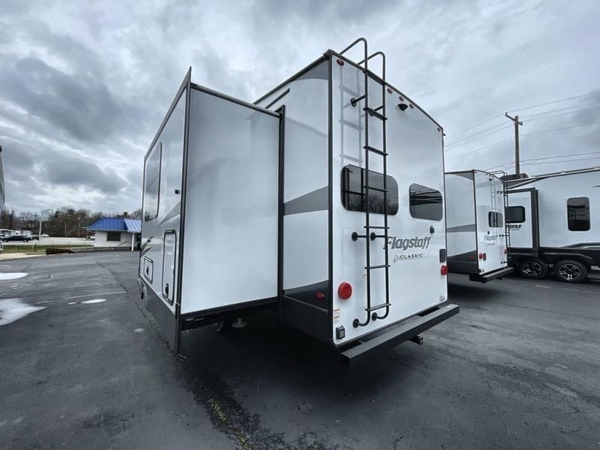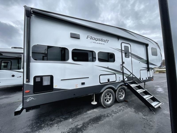 Each one of these Forest River Flagstaff Classic fifth wheels or travel trailers will be your home on wheels! Their quality craftsmanship and attention to detail shines through the surface-coated steel I-beam frame on fifth wheels, the enclosed underbelly, the radius roof with vaulted interior ceilings, and six-sided fully aluminum-framed floor, walls, and roof. Towing your unit will be easy with the torsion axle, Rubber-Ryde suspension, and nitrogen-filled Goodyear Endurance tires. You will even reduce your use of water with the Showermiser water saving system in the bathroom. A few other convenient features you will enjoy include a control panel with WeRV app control, designer headboard and bedding, and an outside hot and cold water port. Come choose your favorite one today!