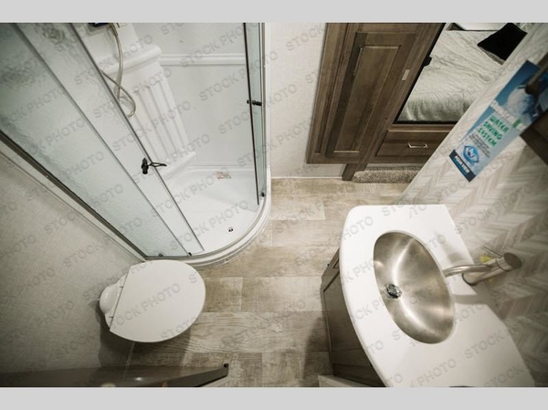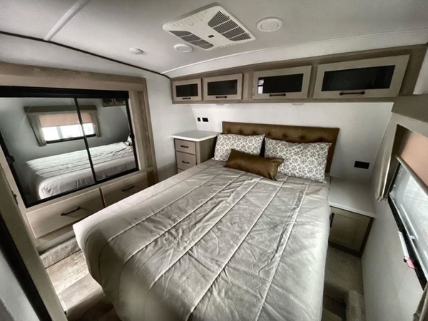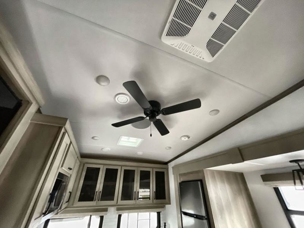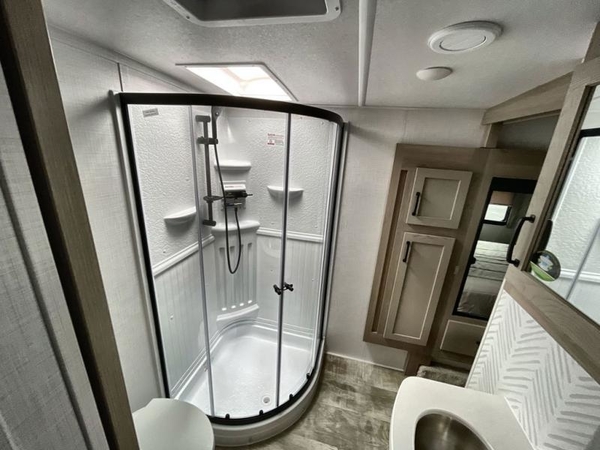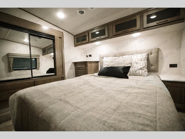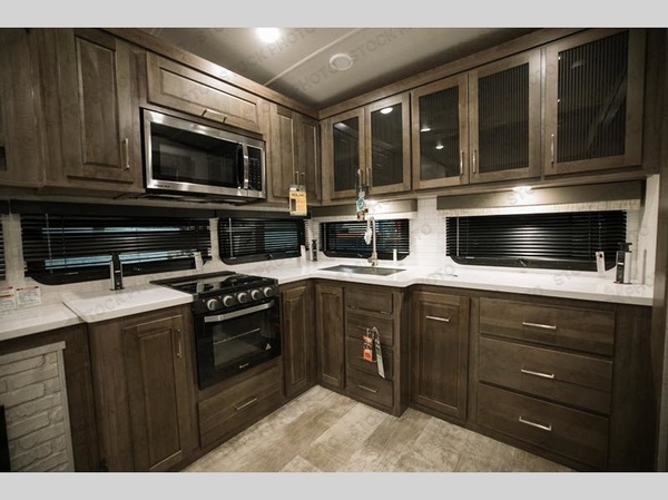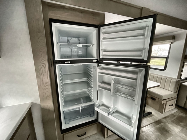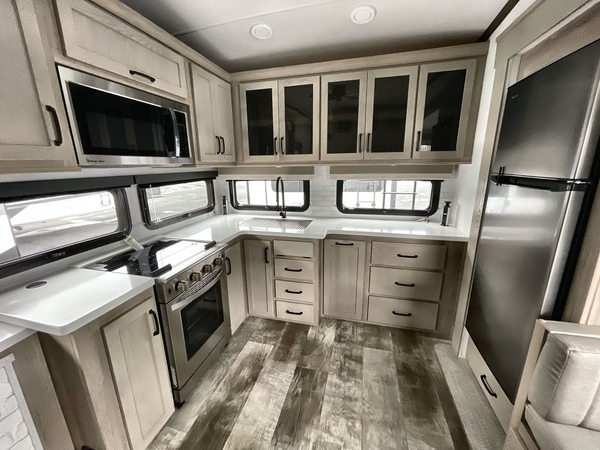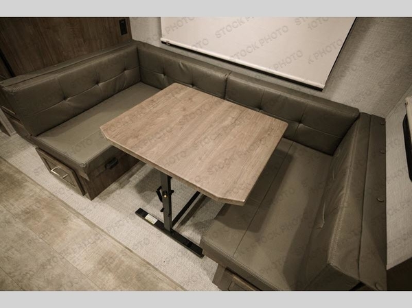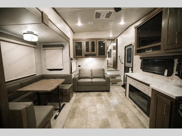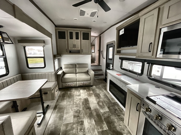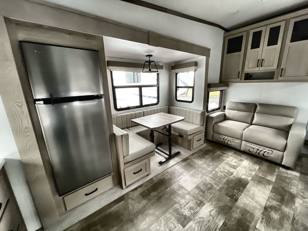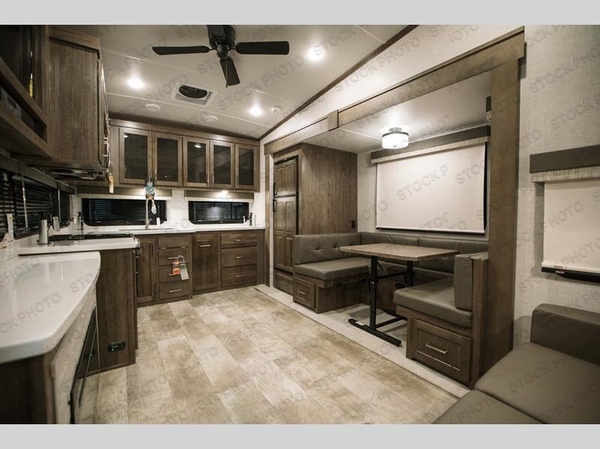 The perfect couple's fifth wheel offers privacy in a front bedroom with a queen bed, a slide out wardrobe providing more floor space, and more storage for your things. You will also appreciate the second entry into the bathroom from the bedroom, and the linen storage in the bathroom and the radius shower that saves floor space. The cook will love all the counterspace and cabinets provided in the rear kitchen and along the side wall, plus the ceiling fan can keep the air circulating when the air conditioner is off. The large king U-shaped dinette allows you to play games, dine, and even work with lots of seating and table space for many to gather when you invite guests over.
