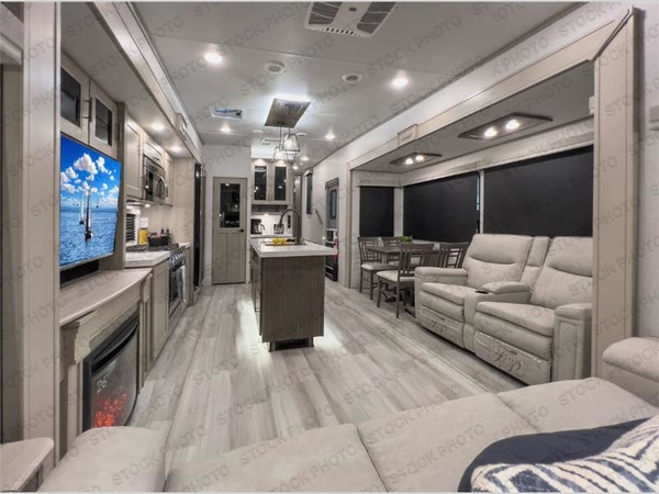 Any Grand Design Influence fifth wheel features five-sided aluminum cage construction with a walk-on roof and a fully enclosed underbelly with heated tanks and storage for all weather camping. For peace of mind, the MORryde CRE3000 Suspension system and ABS braking system will provide safe and smooth towing, and the 101" widebody construction offers all the room you need and that is before multiple slides are fully engaged. You will appreciate the keyed alike locks, slam-latch baggage doors with magnetic door catches, exterior security light, and solid surface entry steps. On the inside, Congoleum flooring, premium roller shades for privacy, a hallway handrail for safety, and nightstands with USB ports to keep all of your electronics fully charged. You will also love the On Demand tankless water heater when showering, plus the added heat and ambiance from an electric fireplace, and so much more!