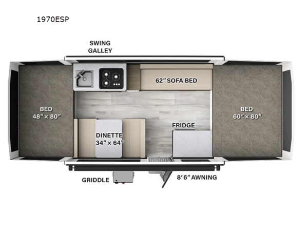 Easy to store, easy to tow and easy to set up is what you will enjoy each and every time you and your group or family of six head out to the campgrounds! There are two tent end beds allowing four to sleep above ground, plus a sofa bed and booth dinette that can double as dining and sleeping space. The cook will have a swing galley with a range and sink to make meals inside as well as an exterior griddle. The interior also offers residential style cabinet doors, full extension metal drawer guides, plus USB charging ports to keep the electronics ready.